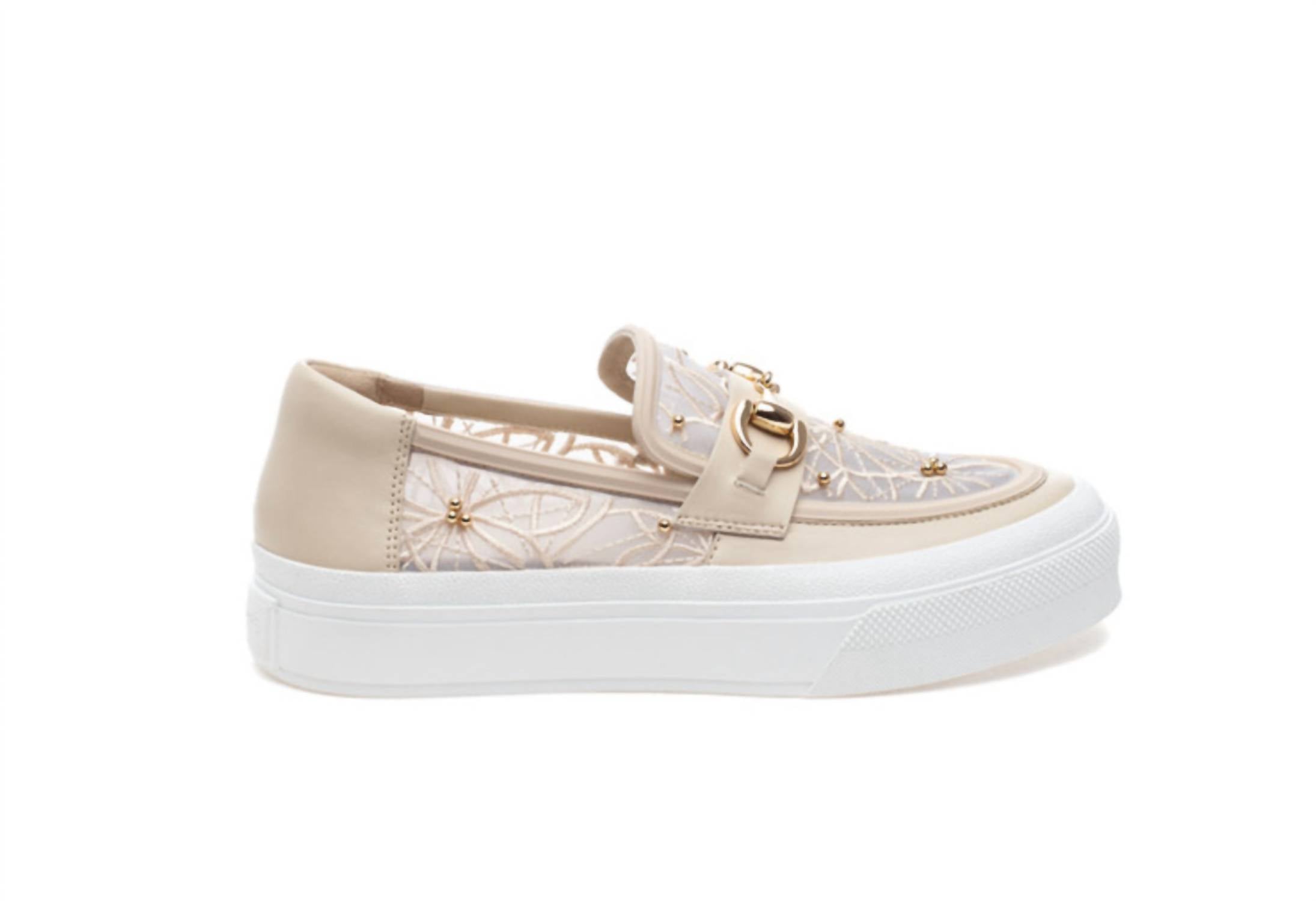 Step into understated elegance with the Women's Georgy Loafer by J/SLIDES in a refined beige hue. Featuring a lace and leather upper adorned with sophisticated embroidery and gold studs, these loafers boast a chic horsebit buckle detail. The design ensures comfort with a cushioned footbed and removable insole, all set on a practical 1.5" platform. Ideal for fall travels, these imported loafers echo quiet luxury.