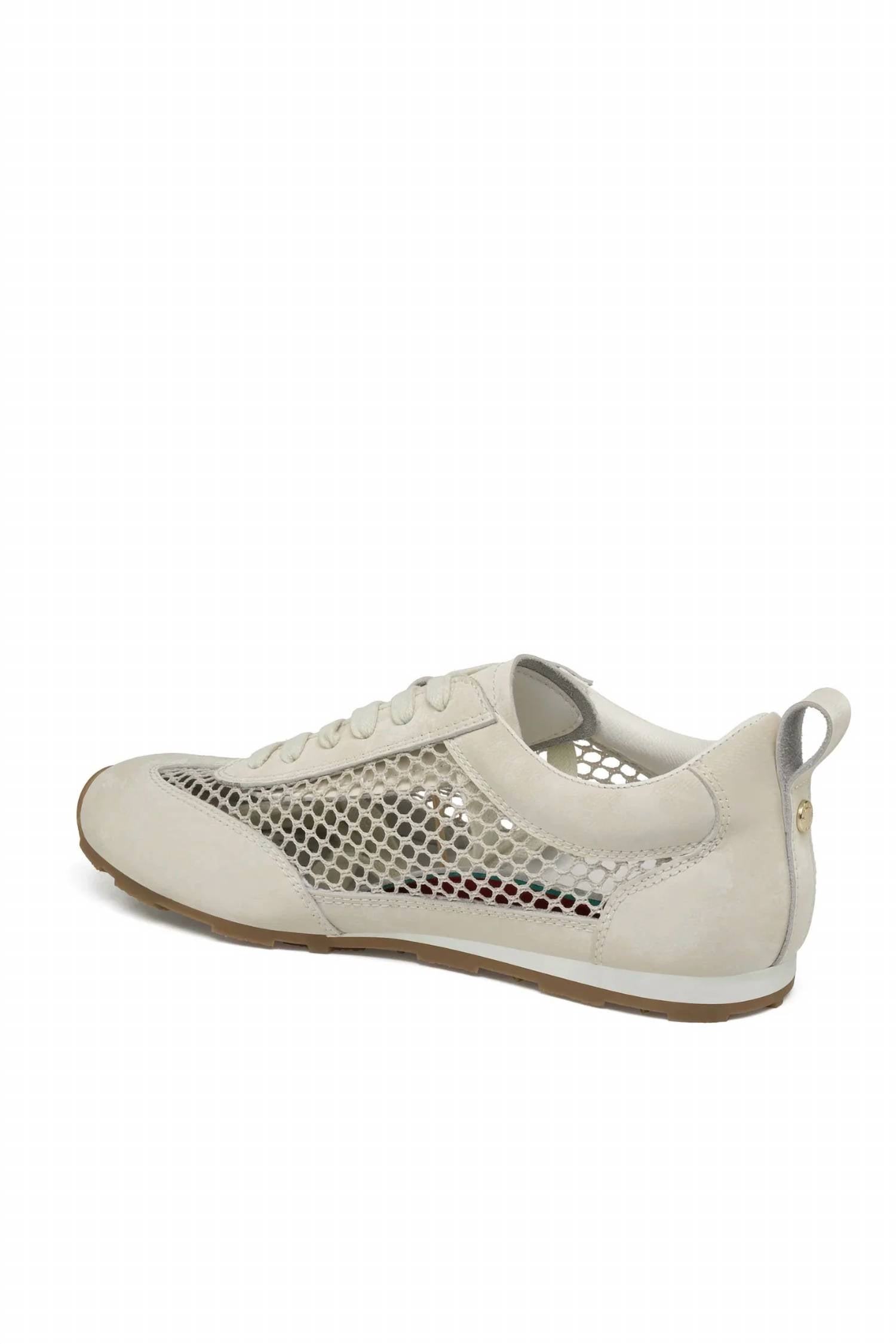 Step into comfort with the Women's Penny Sneaker by J/SLIDES, featuring a stylish off-white leather and mesh upper. The sneaker boasts a leather lining and a lugged rubber outsole for durable wear. Its two-layer memory foam insole and 1.2-inch flat heel provide all-day comfort. The lace closure ensures a snug fit, while the round toe design offers a relaxed, casual look.