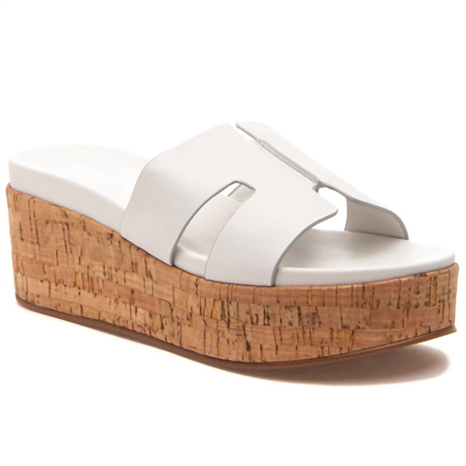 Dresses, denim, shorts... these wedges go with just about anything. Elevate your summer style with the Women's Queenie Sandal by J/SLIDES in a chic white hue. This open-toe sandal features a contemporary geometric design atop approximately a 2.5-inch natural cork wedge, perfect for making a statement. Crafted with a leather upper and lining, it ensures comfort with its cushioned footbed and durability with a rubber sole. Imported and true to size, this versatile piece is a must-have for any wardrobe.