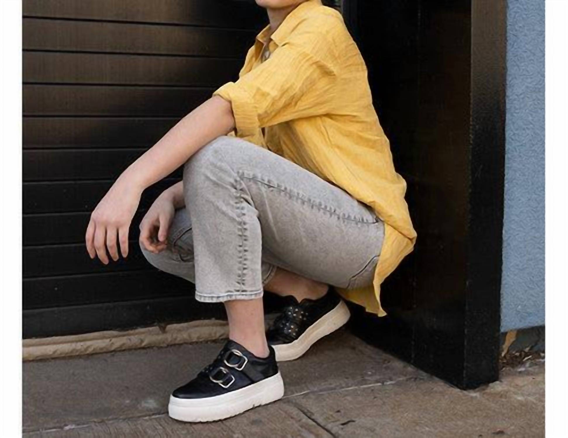 Cute, functional, and comfortable. These sneakers check all the boxes. Elevate your sneaker game with the Women's Waldo Leather Sneaker Shoes by J/SLIDES, a stylish nod to '90s fashion in sleek black. Featuring a leather upper and lining, these sneakers offer premium comfort with a cushioned footbed and removable insole. The design is enhanced with two-tone metal non-adjustable buckles and a hook-and-loop strap for convenience, set on approximately 1.75" AIR-LITE platform and wedge heel. Crafted with a durable rubber sole, these sneakers are true to size and make an ideal choice for spring and Thanksgiving outings.
