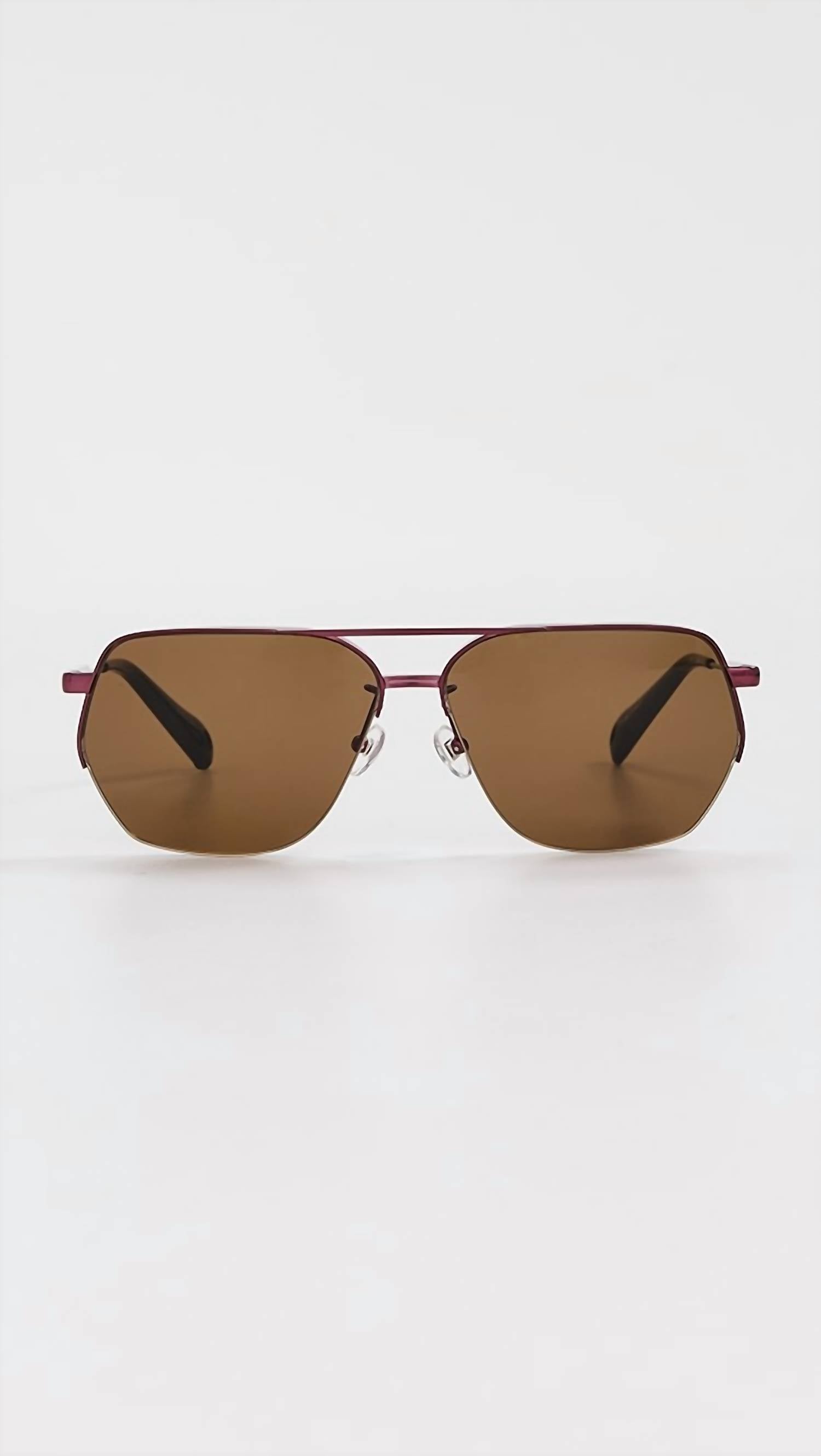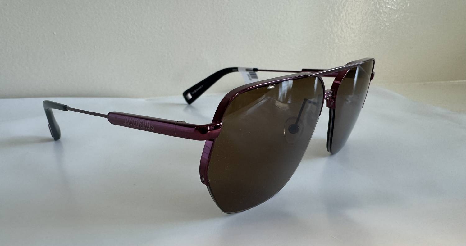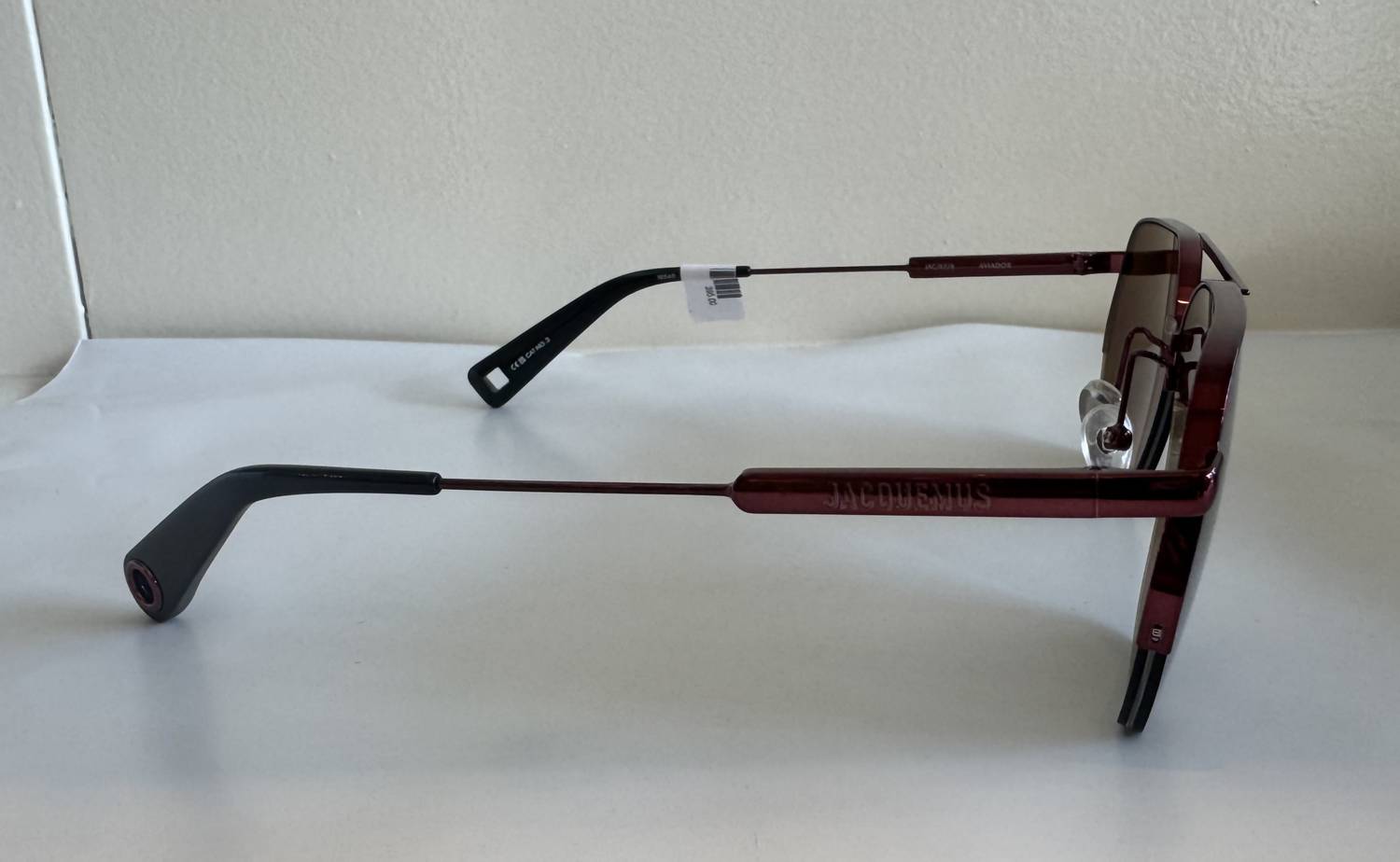 Introducing the Aviator Polarized Sunglasses Aviador by Jacquemus, a stylish choice in Bordeaux/Black/Brown for a modern look. These aviator-style sunglasses feature polarized plastic lenses and a durable metal frame. Dimensions include a lens width of 64 mm, bridge width of 12 mm, and arm length of 145 mm, with an overall width of 6 inches and height of 2 inches. Originating from Japan, these sunglasses offer both fashion and function.