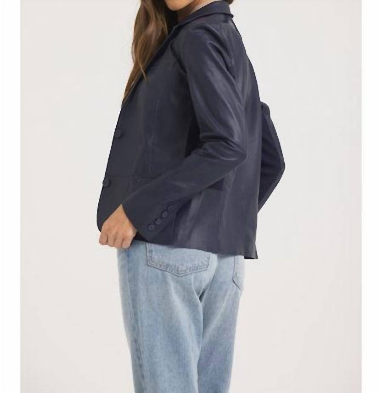 Tailored to perfection, this blazer will be your go-to jacket for years to come. Elevate your spring wardrobe with the Allison Burnished Blazer in Indigo by Jakett, a perfect embodiment of laid-back style and sophistication. This long-sleeve leather blazer is designed with a two-button closure and handy front pockets, accentuating its solid, trend-driven look that suits both workwear and vacation settings. Crafted from 100% genuine leather, its unlined design ensures comfort and breathability. Care for this piece with mild soap and cold water to maintain its timeless allure.