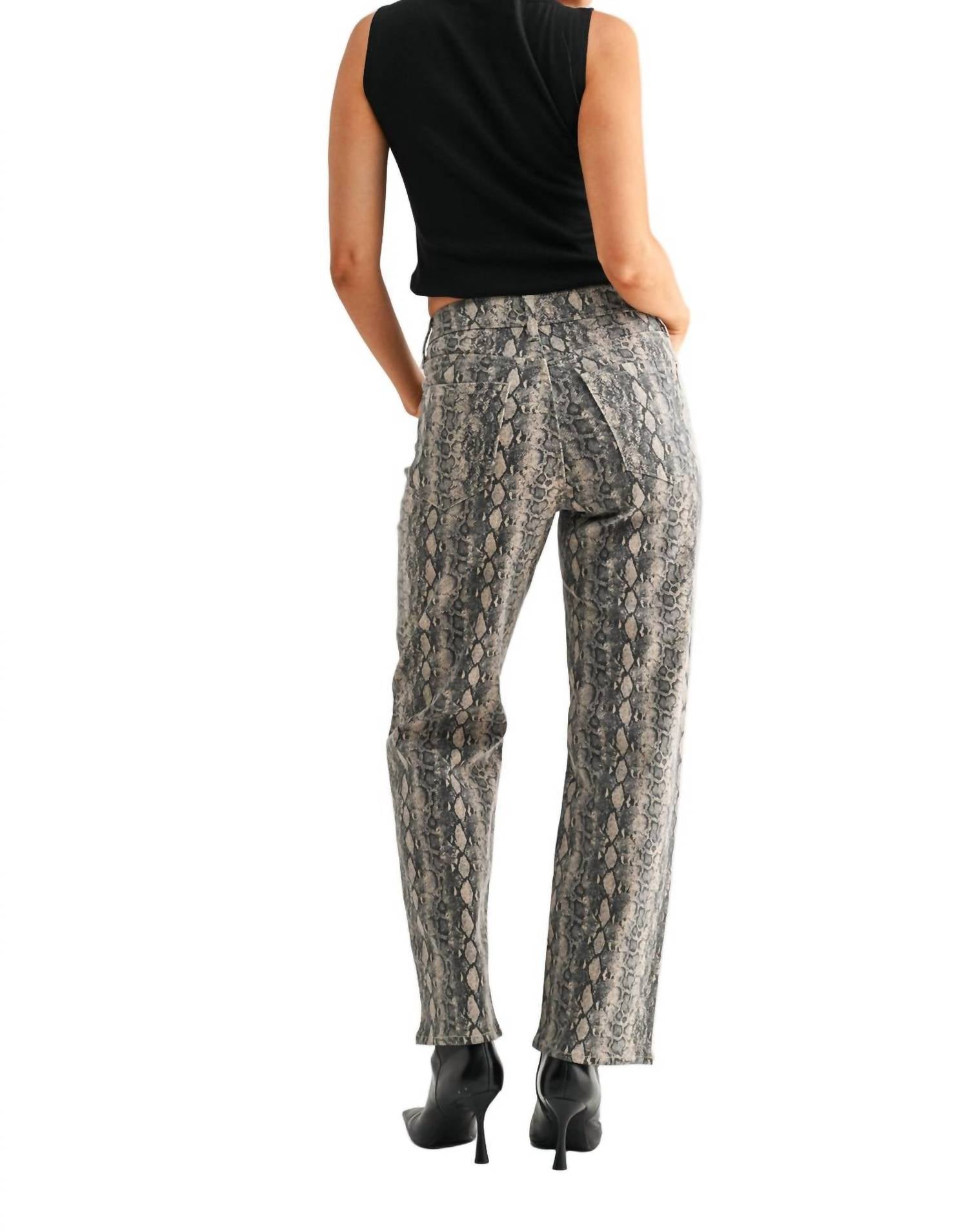 The trend report says boot-cut is in and that's exactly why we love this style. They are fit to perfection, flattering on any body type, and comfortable. They will be your go-to all season long. Introducing the JBD. Flare With Regular Hem Pants, a must-have for your boho chic collection. These women's pants are crafted from a blend of 94.2% cotton, 4.6% polyester, and 1.2% spandex, ensuring comfort and flexibility. Featuring a high-rise fit with a relaxed, flared leg, they have a 30" inseam and 29" waist, closed with a button and zip closure and equipped with practical pockets. Patterned in a striking snake print, they're machine washable and can be tumble dried, offering effortless style for spring occasions like anniversaries.