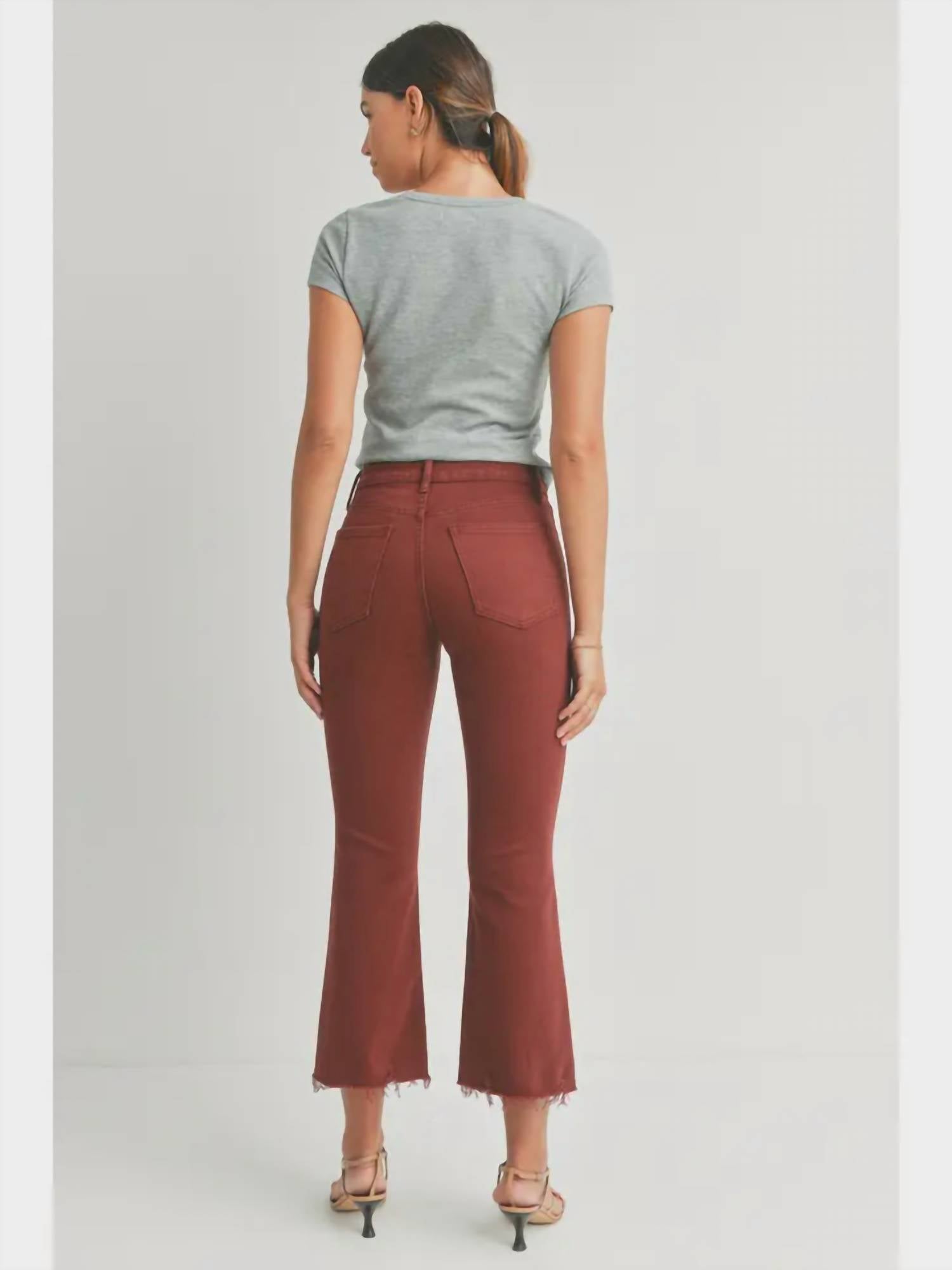 Introducing the High Rise Crop Flare by JBD, a chic option in a vibrant Ruby hue. Featuring a comfortable flared leg design, these jeans slim through the thigh and elegantly flare at the knee, perfect for showcasing your favorite boots. With a practical five-pocket styling, a distressed raw hem, and a bit of stretch, the jeans ensure both style and comfort. Key specifications include a 10" rise, 26" inseam, and 9" opening, completed with a zip closure. Care: Machine wash.