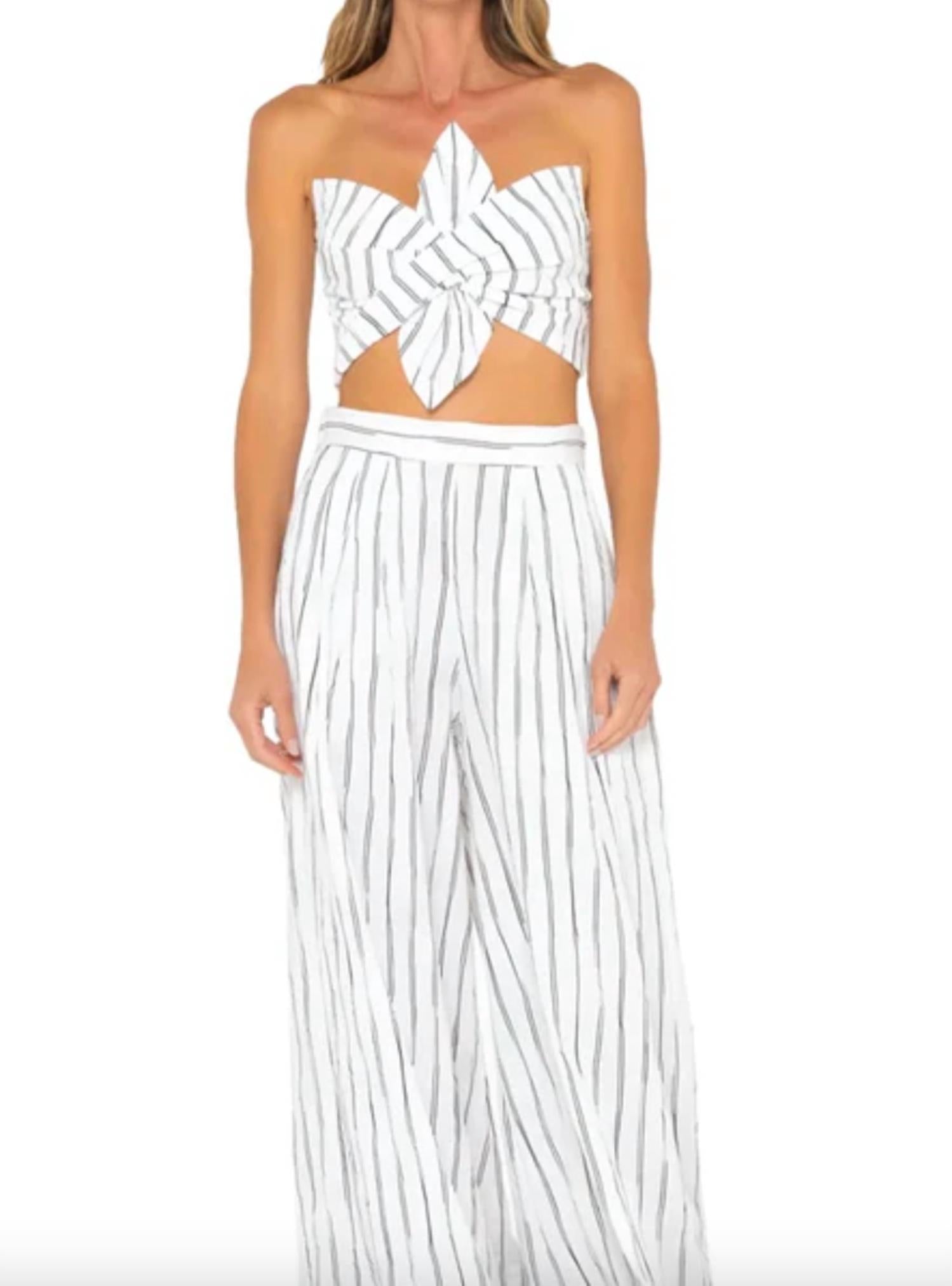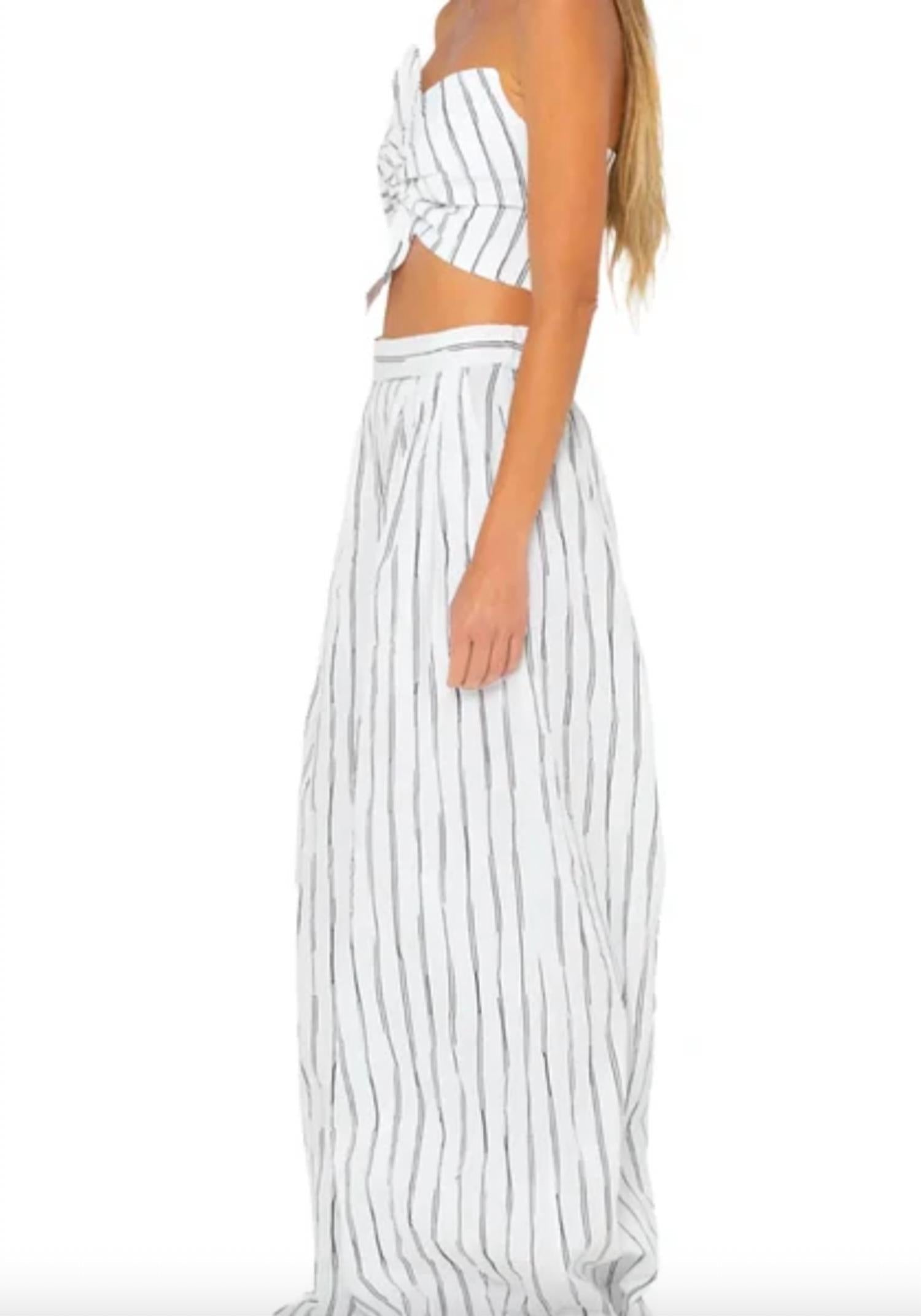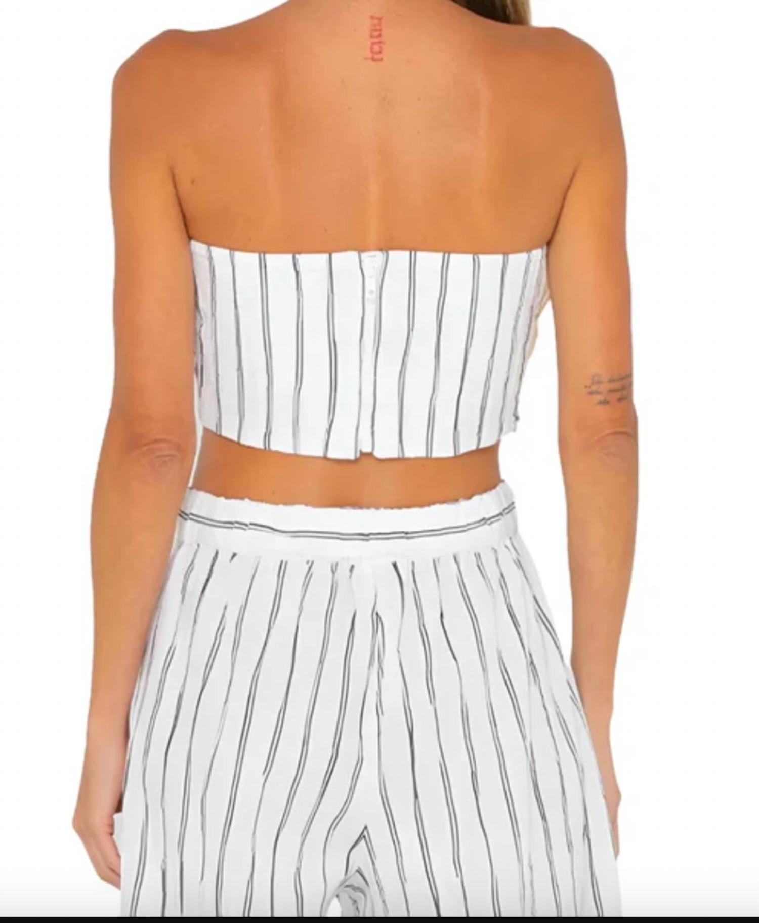 The perfect crop top for those warmer weather days. Meet the Clementine Top by JBQ, a chic addition to any wardrobe with its elegant black and white stripe pattern. This strapless crop top showcases a sweetheart neckline and a twisted fabric detail in the front for added flair. Made in the USA, it features an exposed back zipper closure for easy wear. This top fits true to size and beautifully complements any modern outfit.