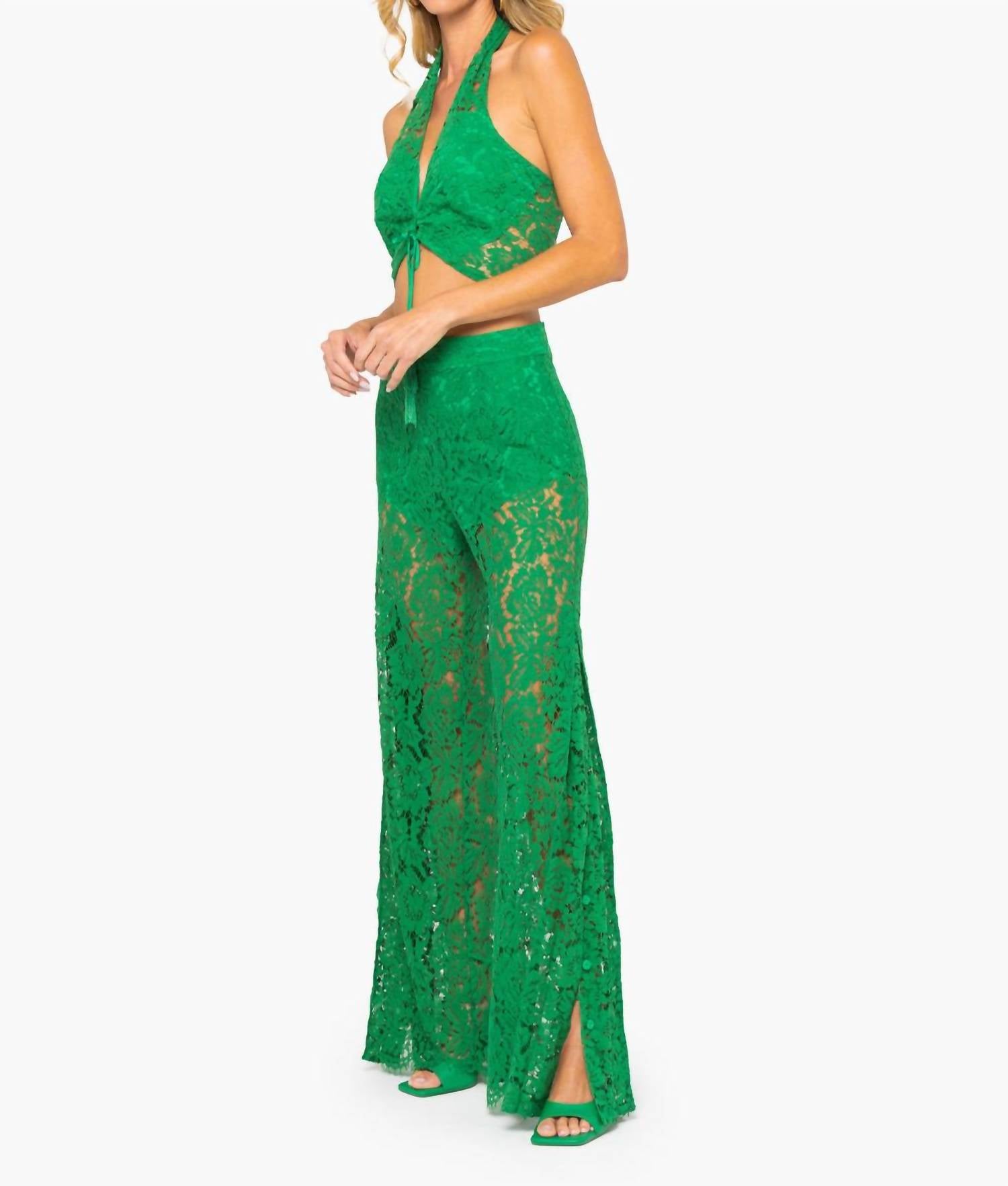 Step into style with the Lace Stevie Pant by JBQ, available in vivid Kelly Green for a striking statement. These high-rise, wide-leg pants feature a mid-length slit and adjustable button-up detail, crafted entirely from 100% Viscose. Proudly made in the USA, these pants offer a flattering silhouette without pockets. Care for them with ease using a machine wash.
