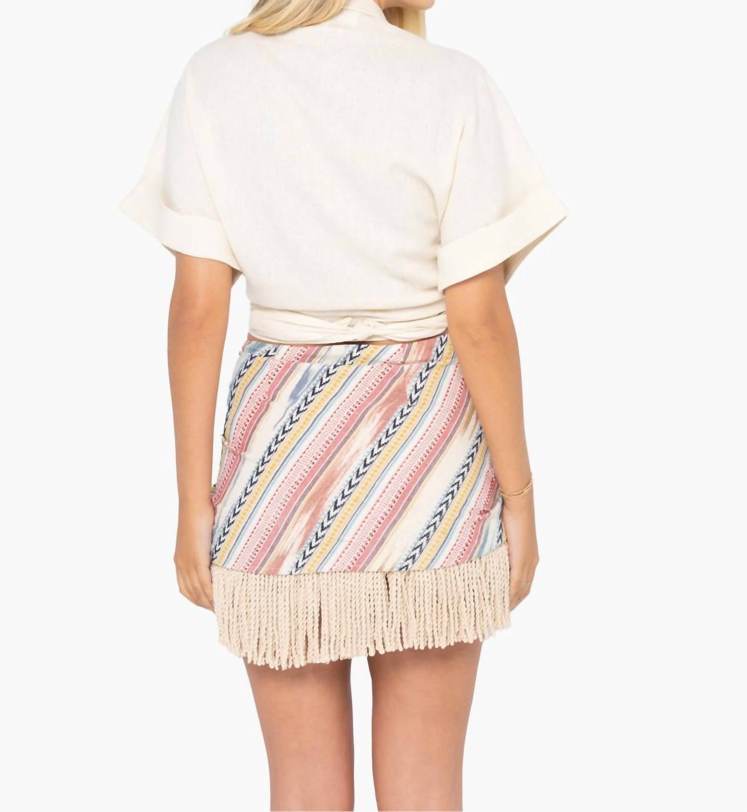 The perfect mini skirt does exist. Embrace the vibrant style of summer vacations with the Maya Mini Skirt by JBQ. Crafted from 100% Cotton, this Aztec Canvas masterpiece in Jacquard Multi boasts a striking jacquard pattern, enhanced with ruching at the front and a playful tie closure adorned with fringe braided rope trim. Proudly made in the USA of imported materials, this skirt is a statement piece that speaks volumes about your fashion-forward sensibilities. Care instructions suggest a cold wash to maintain the fabric's quality and color integrity.