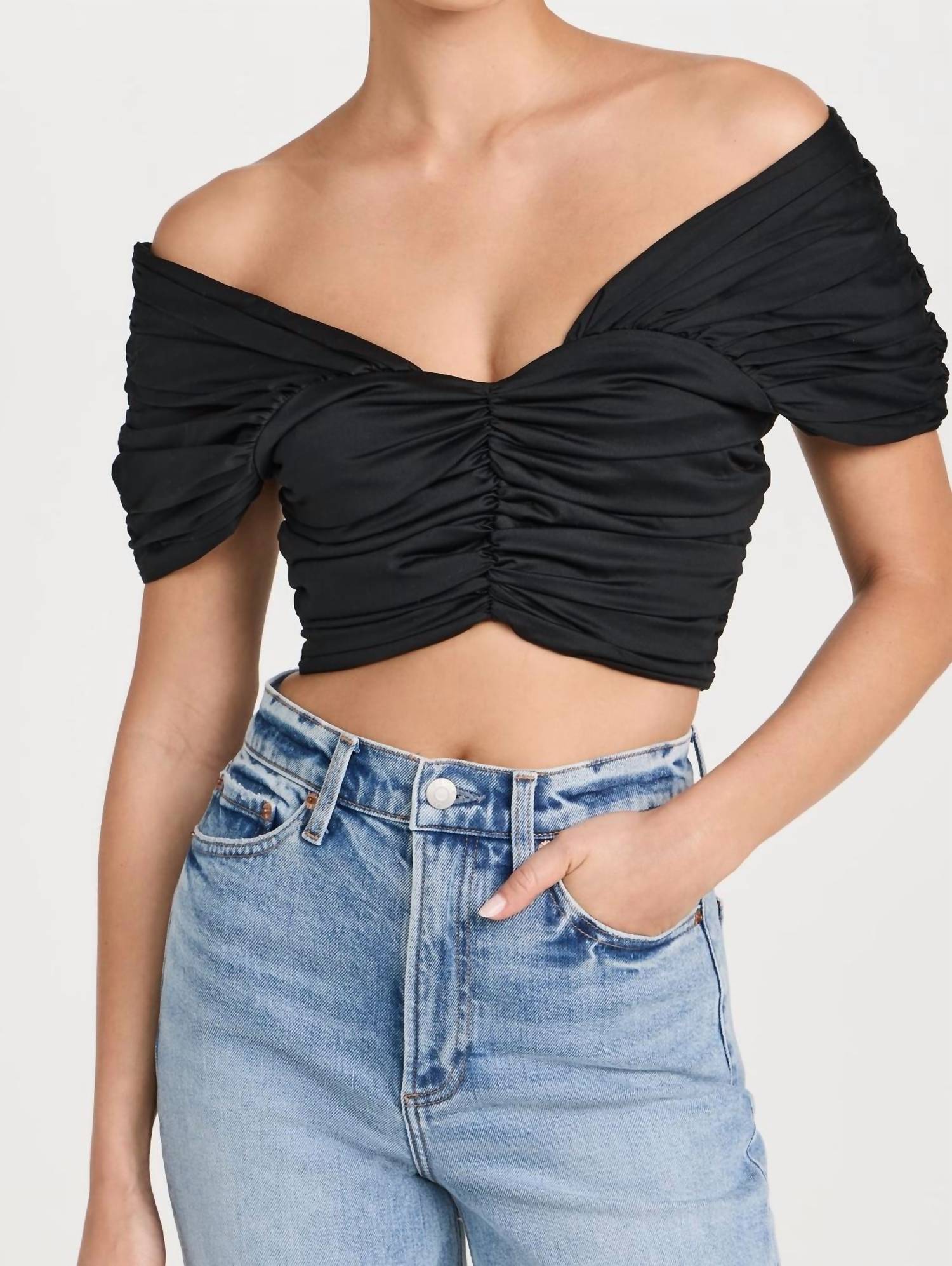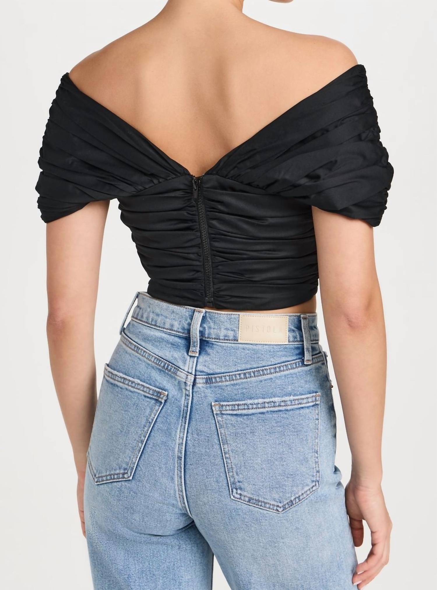 The perfect crop top for those warmer weather days. Introducing the Rose Top by JBQ, a chic off-the-shoulder crop top in classic black with a sleek, modern silhouette. This short-sleeve piece features allover ruching in a lightweight stretch poplin fabric, crafted from a cotton blend for comfort and style. It measures 15.75 inches in length and includes a convenient zip closure at the back. Made in the USA and designed for easy care, simply dry clean to maintain its elegant appeal.