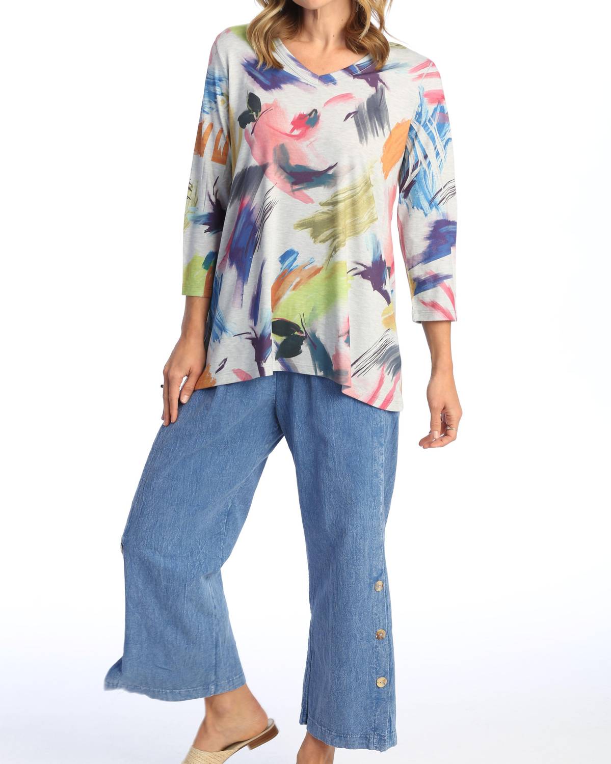 The perfect long sleeve tee that goes with just about anything. Elevate your summer wardrobe with the Jess & Jane Women's Vernet V Neck High Low Tunic Top, a boho chic essential in a vibrant multi-color pattern. Featuring a V-neckline and three-quarter sleeves, this tunic top showcases a flattering high-low hem with the back being longer for added coverage. Crafted from a soft and stretchy blend of 87% Polyester, 10% Rayon, and 3% Spandex, this lightweight piece offers both comfort and style. Made in the USA, it comes with a pull-on closure and is easy to care for with a cold wash and line dry. Available in multiple sizes, including Medium with a bust of 40" and length of 29", up to 3X with a bust of 54" and length of 32.5".