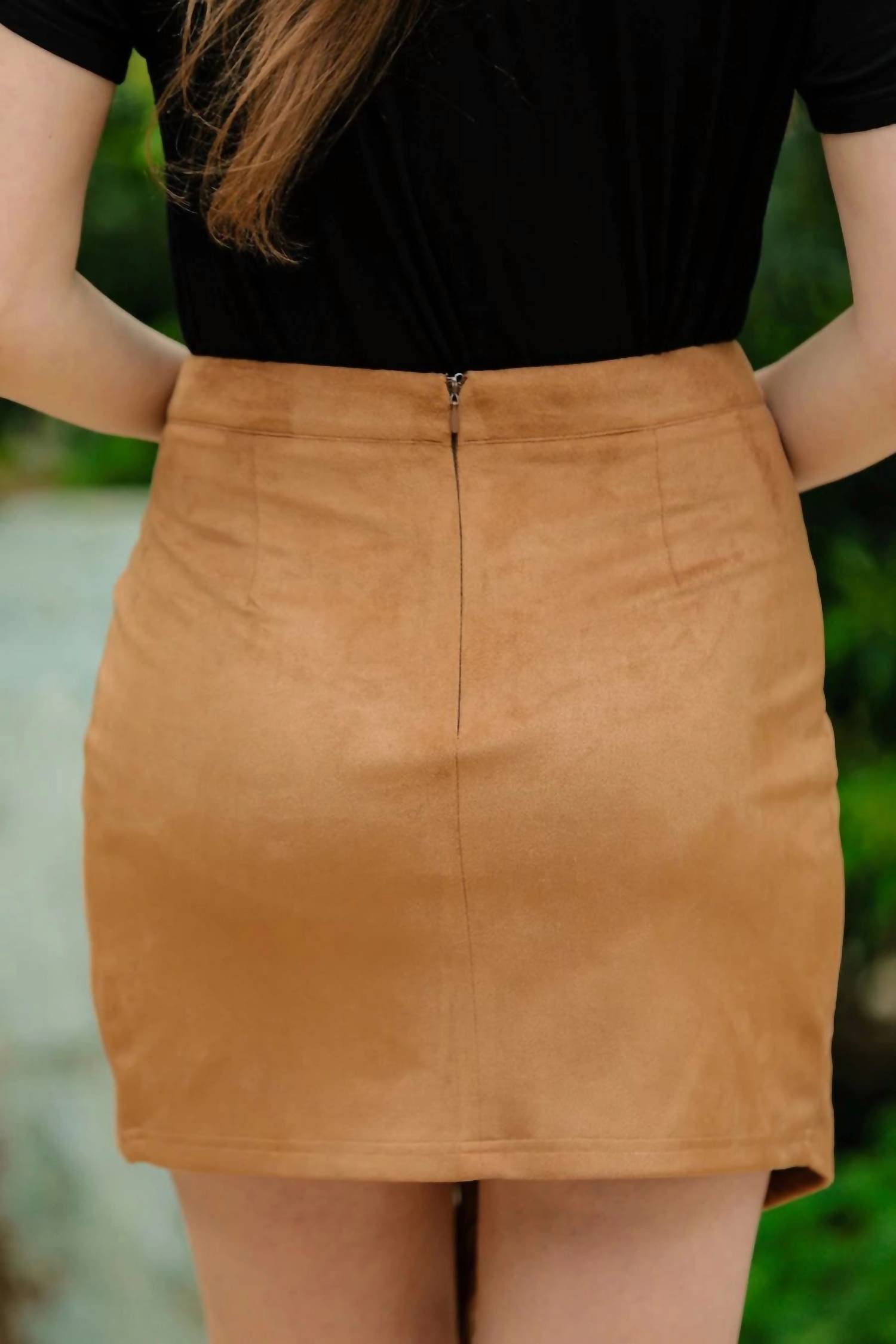 This asymmetrical skirt shows just the right amount of leg. Step out in confidence with the Wynn Mini Skirt by Jess Lea, a boho-chic piece that flawlessly complements any wardrobe. Crafted from a soft and luxurious faux suede, this solid brown asymmetrical skirt is 16.5 inches in length, designed specifically for a stylish vacation or a night out. Fabric Composition: 96% Poly, 4% Spandex. Note: This garment runs small, so consider sizing up for the perfect fit.