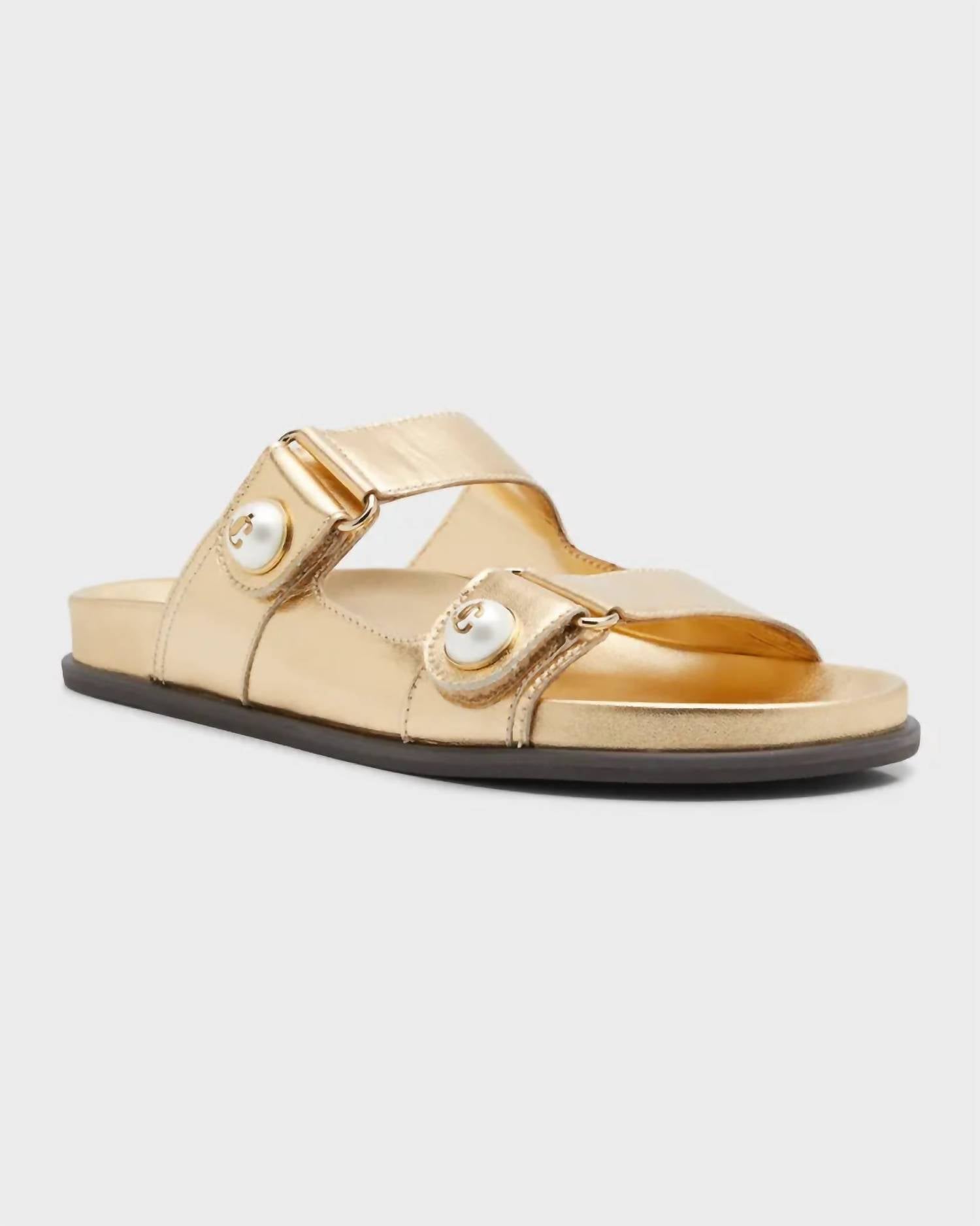 Elevate your vacation wardrobe with the Women's Fayence Metallic Slide by JIMMY CHOO, a luxurious sandal crafted in shimmering gold. These slides feature a metallic nappa leather upper adorned with pearl embellishment straps and gold-tone hardware. The design includes a convenient Velcro fastening, a comfortable leather insole, and a durable rubber sole. Perfect for adding a touch of elegance to your spring workwear or Easter ensemble, this sandal embraces a flat heel and open toe design for easy wear.