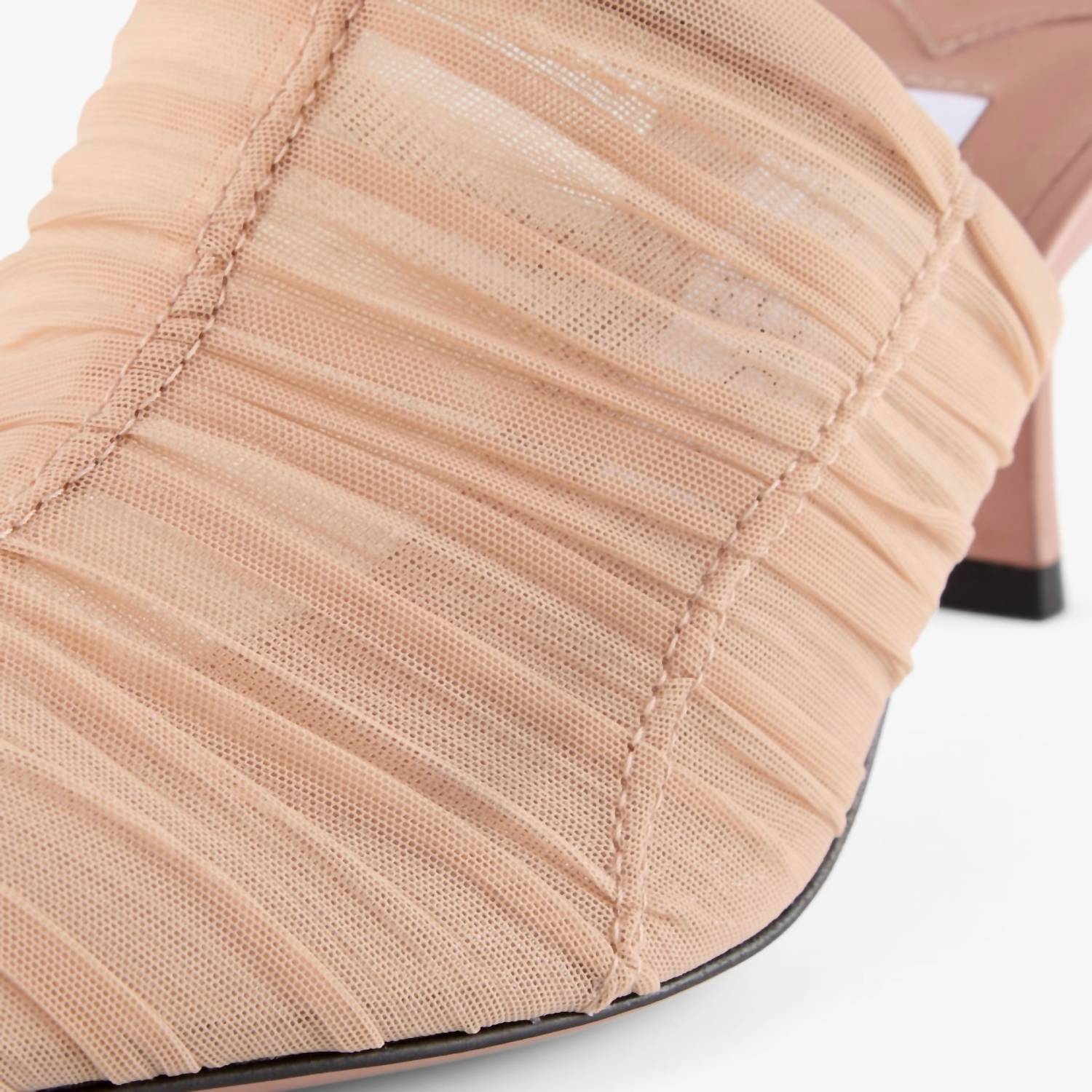 Add a touch of elegance to your footwear collection with the Women's Lotta Ruched Tulle Mule by JIMMY CHOO, designed in sophisticated light clay pink. Featuring a ruched tulle upper and a chic pointed toe, this slip-on silhouette offers a luxurious feel with its leather lining. The mid-height stiletto heel, measuring 65mm (2.5"), ensures both style and comfort, perfect for holiday parties or a workwear upgrade. A combination leather and rubber sole completes the design, making it an ideal choice for spring occasions.