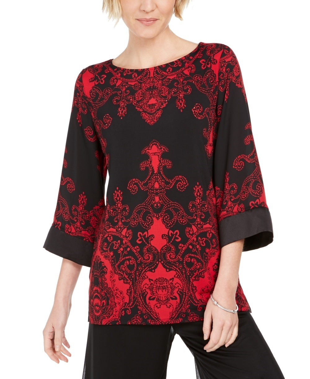 Approx. length: 25"; relaxed fit|Designed to fit and flatter 5'4" and under frame|Scoop neckline|3/4-length bell sleeves|Polyester/spandex; sleeves: polyester; trim: rhinestone