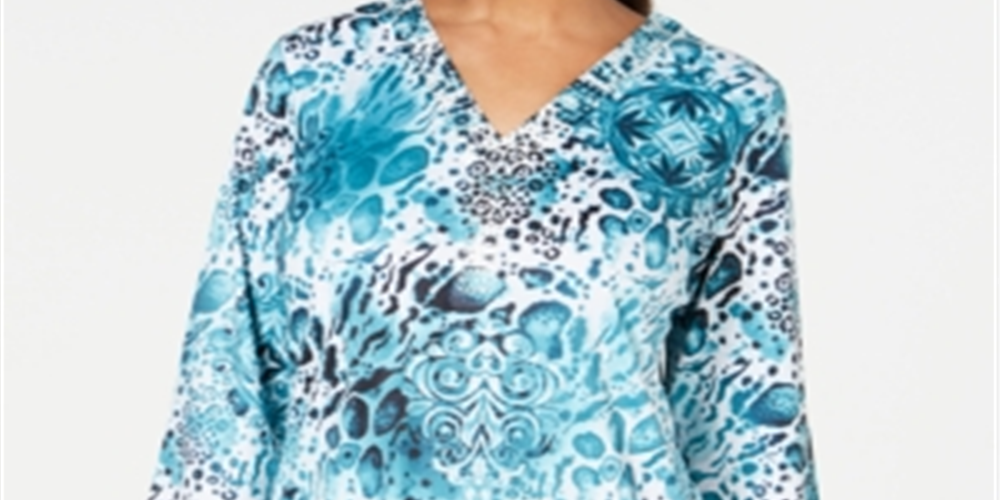 JM Collection Women's Split Neck Top Green Leopard Size Petite S/M