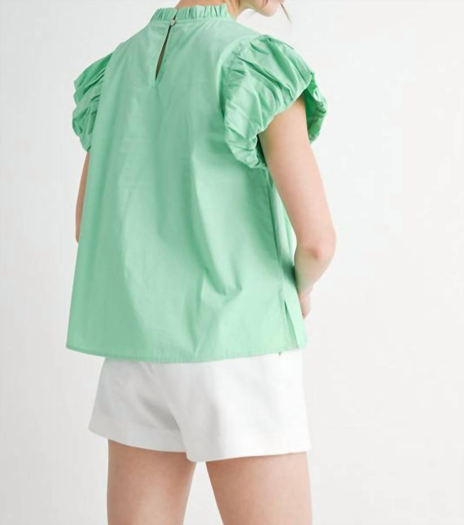 A timeless blouse that will never go out of style. Elevate your wardrobe with the Getting Closer Ruffled Top by Jodifl, an embodiment of minimalist charm in a soft mint hue. Crafted from 100% cotton, this blouse features delicate ruffled detailing for a feminine touch, complemented by a mockneck and short sleeves. Designed with a button closure, it offers a versatile fit ideal for summer occasions, such as St. Patrick's Day and dinner parties. Bust measurements are available in sizes: S(38"), M(40"), L(42"), ensuring a perfect fit.