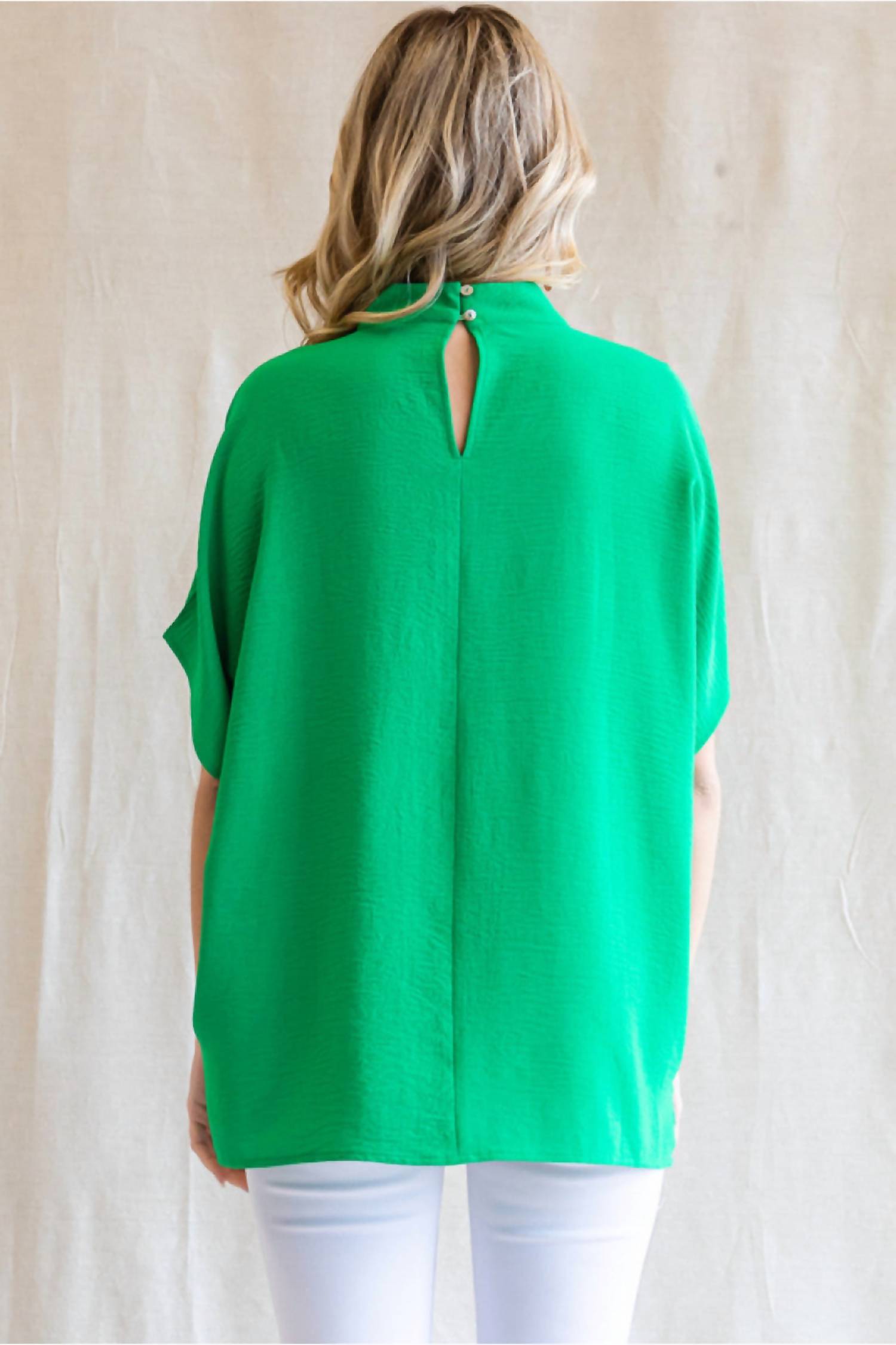 A versatile blouse that works from desk to dinner! Introducing the Look Out Mock Neck Top by Jodifl, a chic addition to your wardrobe in a vibrant Kelly Green, perfect for a summer dinner party or St. Patrick's Day celebration. This women's blouse features short sleeves and a mockneck, offering a trendy "Quiet Luxury" appeal. Made from 100% polyester, it has a relaxed fit that enhances comfort and style, secured with a back button closure. Measurements specify a bust of 52" for Small, 54" for Medium, and 56" for Large, advising a size down for the ideal oversized look.