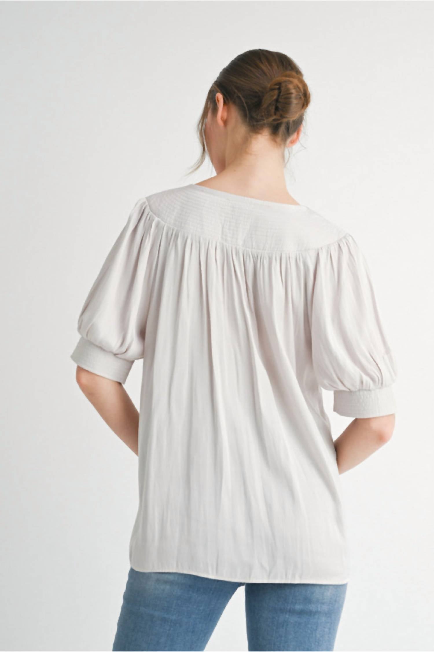 A versatile blouse that works from desk to dinner! Introducing the Short Sleeve V Neck Pleated Top by Jodifl, a stylish piece perfect for summer occasions. Crafted from 100% polyester, this champagne-colored blouse offers both comfort and elegance with its playful contrast piping and trendy puff sleeves. Featuring a flattering banded detailing and a convenient pull-on closure, it ensures a sleek fit. Available in sizes S(0/6), M(8/10), and L(12/14) with bust measurements of S(38"), M(40"), and L(42").