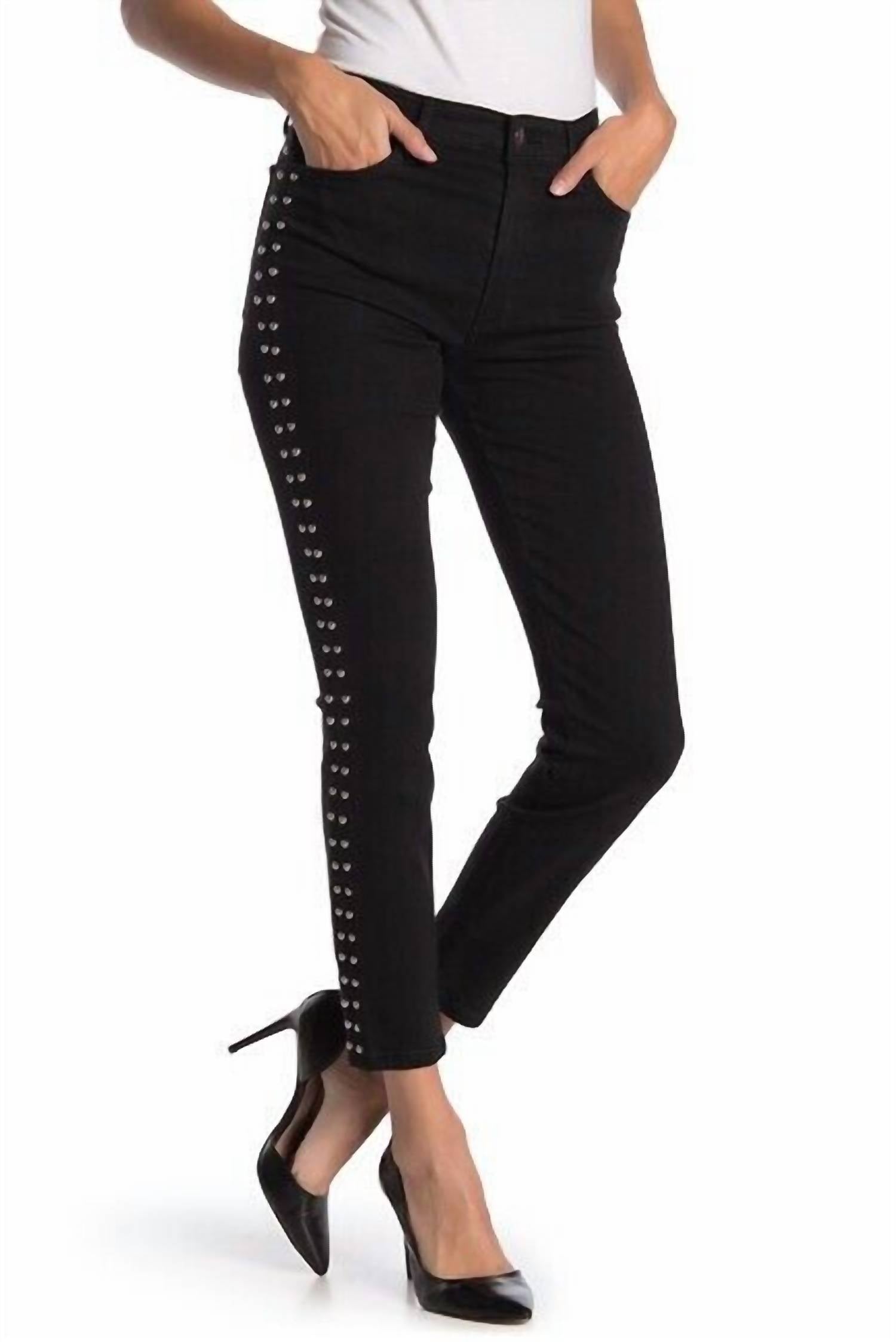 Elevate your style with the Charlie Studded Black High Rise Skinny Ankle Jeans by Joe's Jeans, featuring bold silver-tone studs along the sides. Expertly tailored with a blend of 51% cotton, 23% polyester, 14% lyocell, 10% rayon, and 2% spandex for a comfortable fit. These black jeans boast a high-rise waist with a front rise of 10" and a back rise of 12.5", complete with a skinny leg opening measuring 9" at the hip. Enjoy the convenience of a zip fly with a button closure and a classic 5-pocket construction, complemented by an inseam length of 26.5".