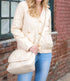 Meet the Johya Puffer Jacket by JOH, a minimalist and stylish beige essential for your fall wardrobe. Crafted with long sleeves, its nylon material ensures a lightweight and warm wear, suitable for travel and Thanksgiving gatherings. Featuring a V-neck design, gold-trimmed button closures, and built-in pockets, it effortlessly combines comfort and practicality. The set includes a matching crossbody bag with a gold chain-link strap, perfect for carrying lightweight essentials.