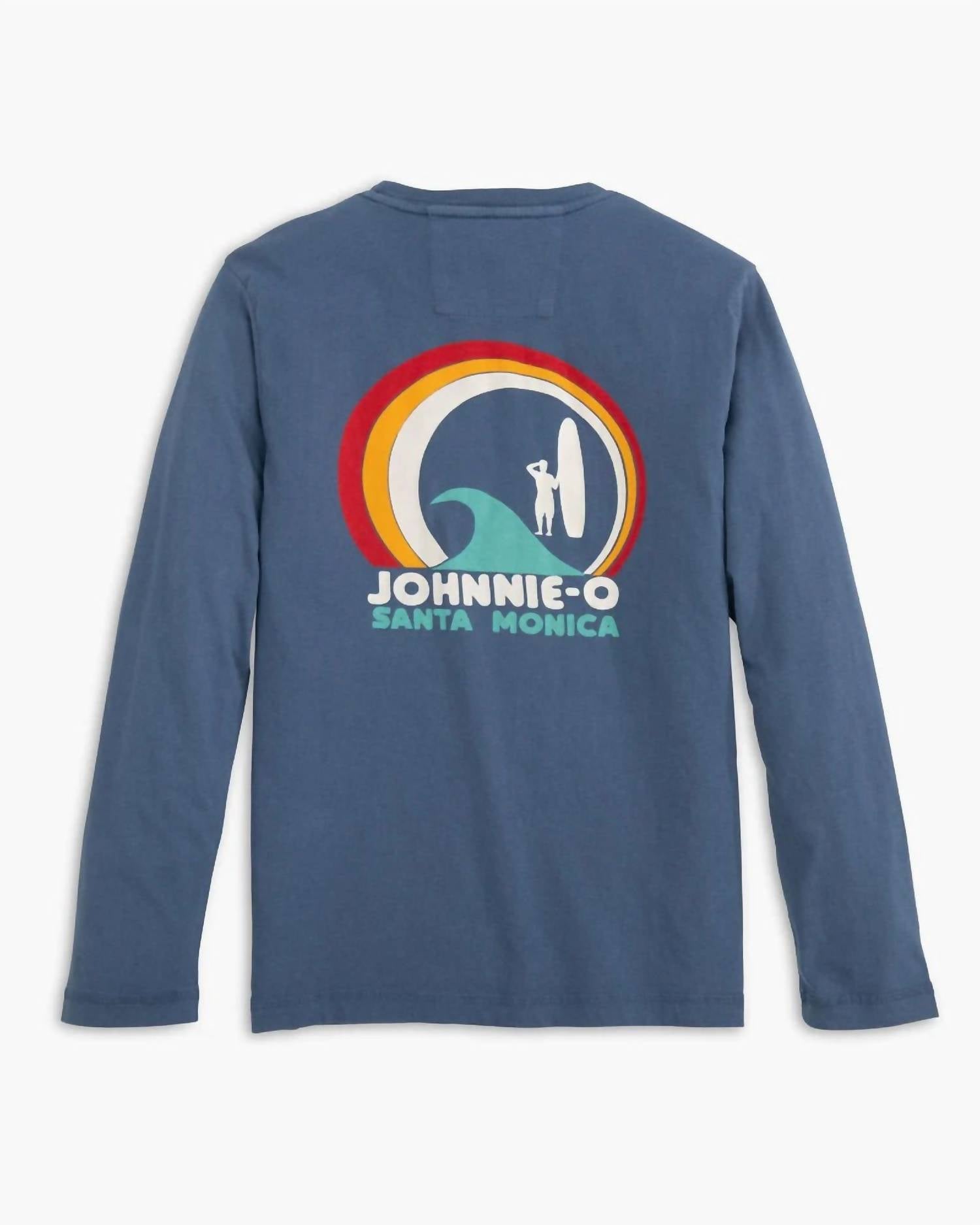 Introducing the Boys 1979 Long Sleeve T-shirt by JOHNNIE-O, a vintage-inspired piece designed in a refreshing Wake color. This graphic crewneck tee features a practical chest pocket with a printed logo, perfect for brightening up fall days. Carefully crafted from 100% cotton, it showcases tonal reverse coverstitch details and is garment dyed and washed with silicone for extra softness. Proudly imported and easy to maintain, it handles machine wash cold on a gentle cycle and can be tumble dried on low.