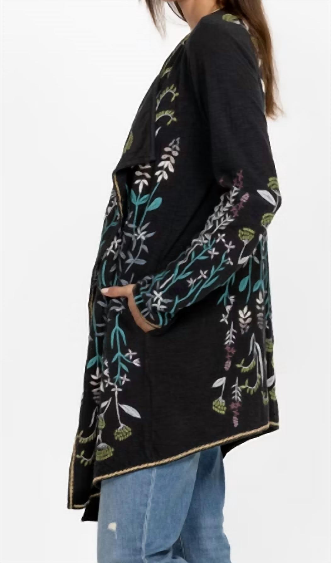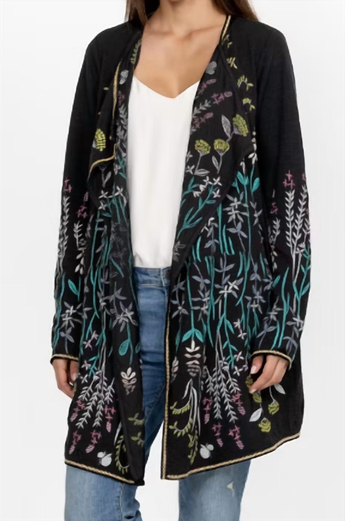 This cardigan will be a sweater-rotation favorite. Elevate your winter wardrobe with the Ashlyn Sweater by Johnny Was, a perfect blend of boho chic style and luxury. This women's cardigan in classic black features a lively patterned design and long sleeves, finished with a versatile V-neck. Made from comfortable cotton, it is designed with a pull-on closure and includes convenient pockets. Care for it easily with machine wash and tumble dry instructions. Ideal for evening events, especially New Year's Eve celebrations.