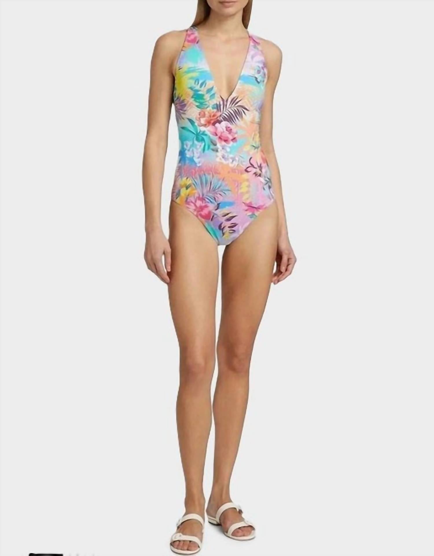This stylish cross-back features a unique Hawaiian floral print and a plunge V-neckline. Pair it with the Zeru Wide Leg Pants and go comfortably from beachside to brunch. Model is 5'8" and wearing a size XSmall. Hand Wash.