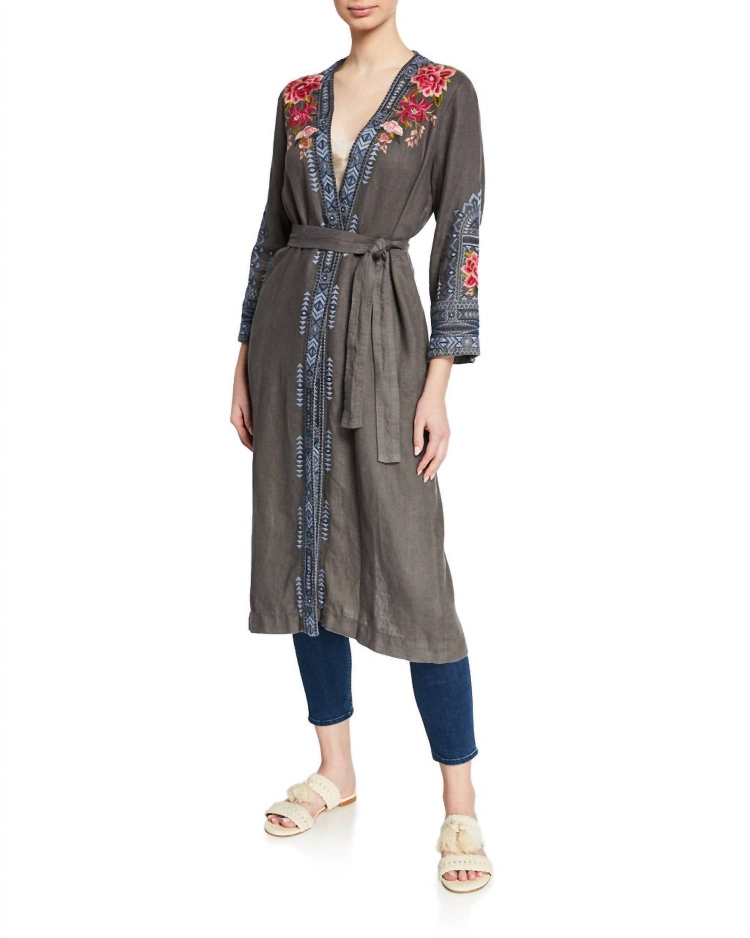 This utility jacket is the perfect combination of cool and feminine. Trendy geometric details and boisterous floral bursts. Made from heavy linen, its length and pockets make it a versatile and functional piece. Embroidered. Tie waist. Machine wash cold with like colors, no bleach, tumble dry low. Warm iron if needed.