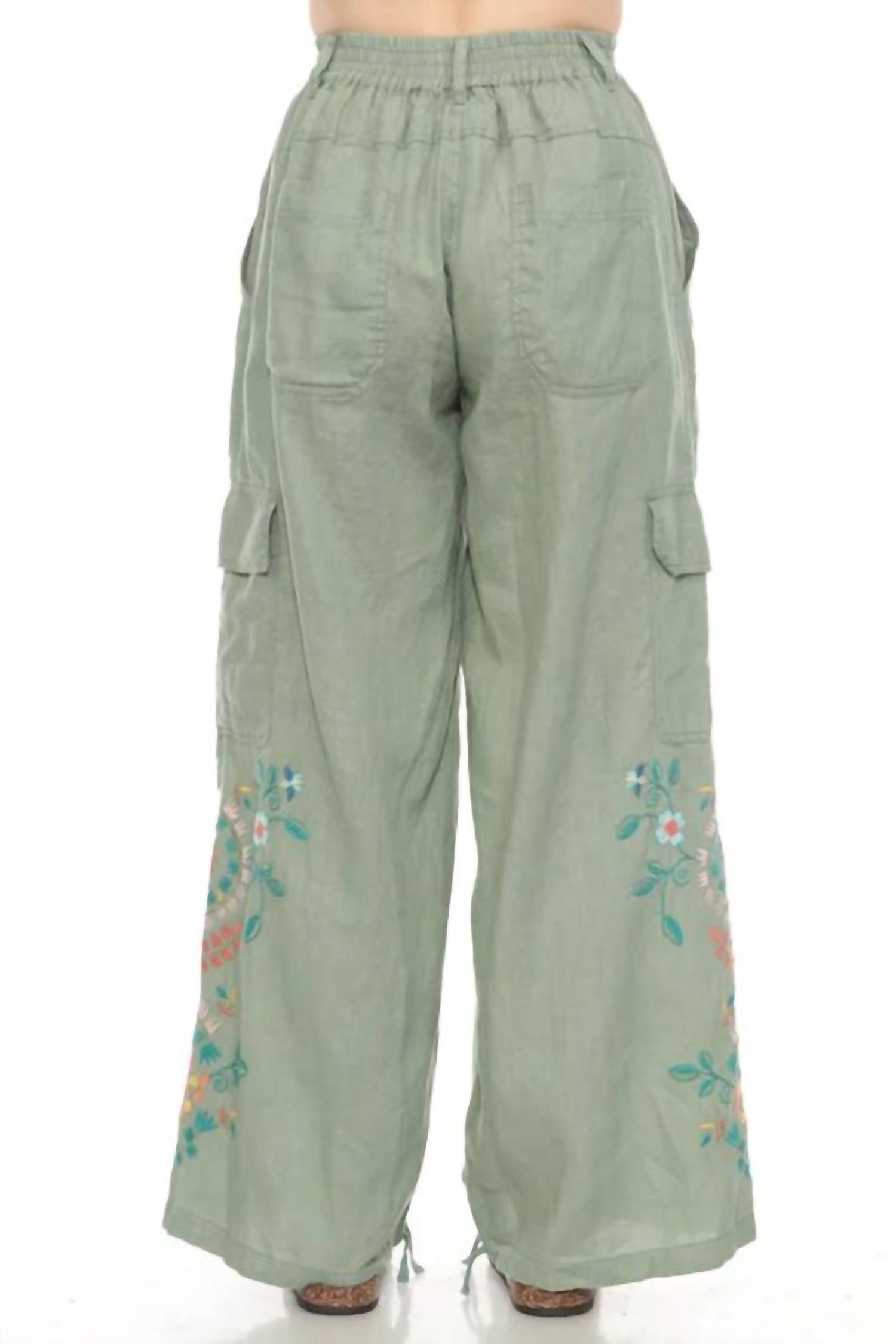 Elevate your casual wardrobe with the Drawstring Hem Cargo Pant—a stylish twist on a classic. These cargo pants are made from breathable linen and offer a relaxed fit with a wide leg silhouette perfect for warm-weather wear. Designed for comfort and function, it features a button and zipper closure paired with an elastic waist for an easy, flexible fit. With six pockets for everyday essentials and intricate floral embroidery on the side, this pant effortlessly blends artistic flair. The drawstring hem lets you customize the look—cinch it up for a tapered style or wear it loose for breezy movement. From weekend errands to laid-back outings, these cargos are your go-to for versatile, statement-ready style.