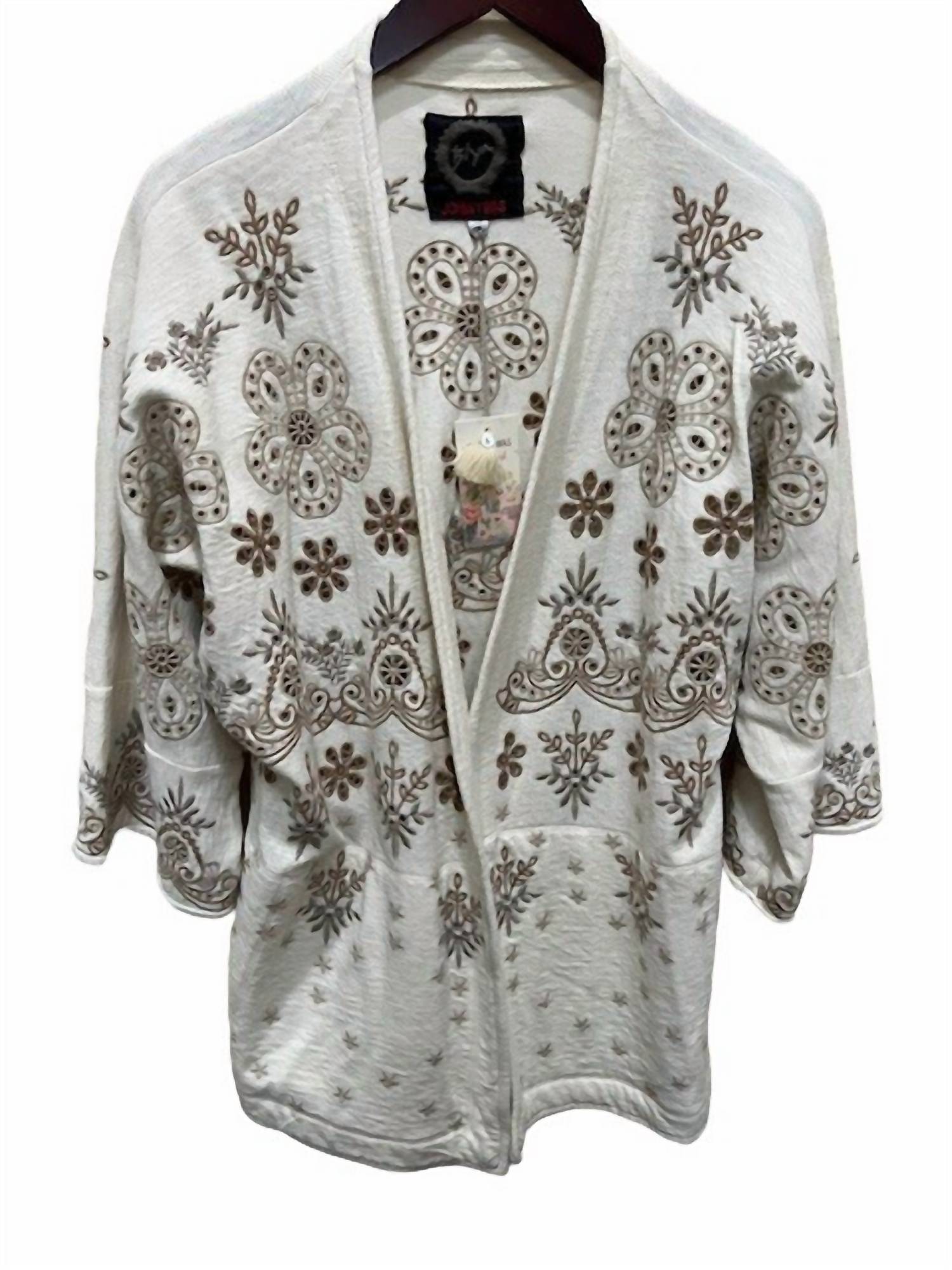 Throw this adorable cardigan over any cami or tank top.This kimono features elegant placement embroidery and an open front design. It includes hidden side pockets for convenience and 3/4 length wide sleeves for a comfortable fit.