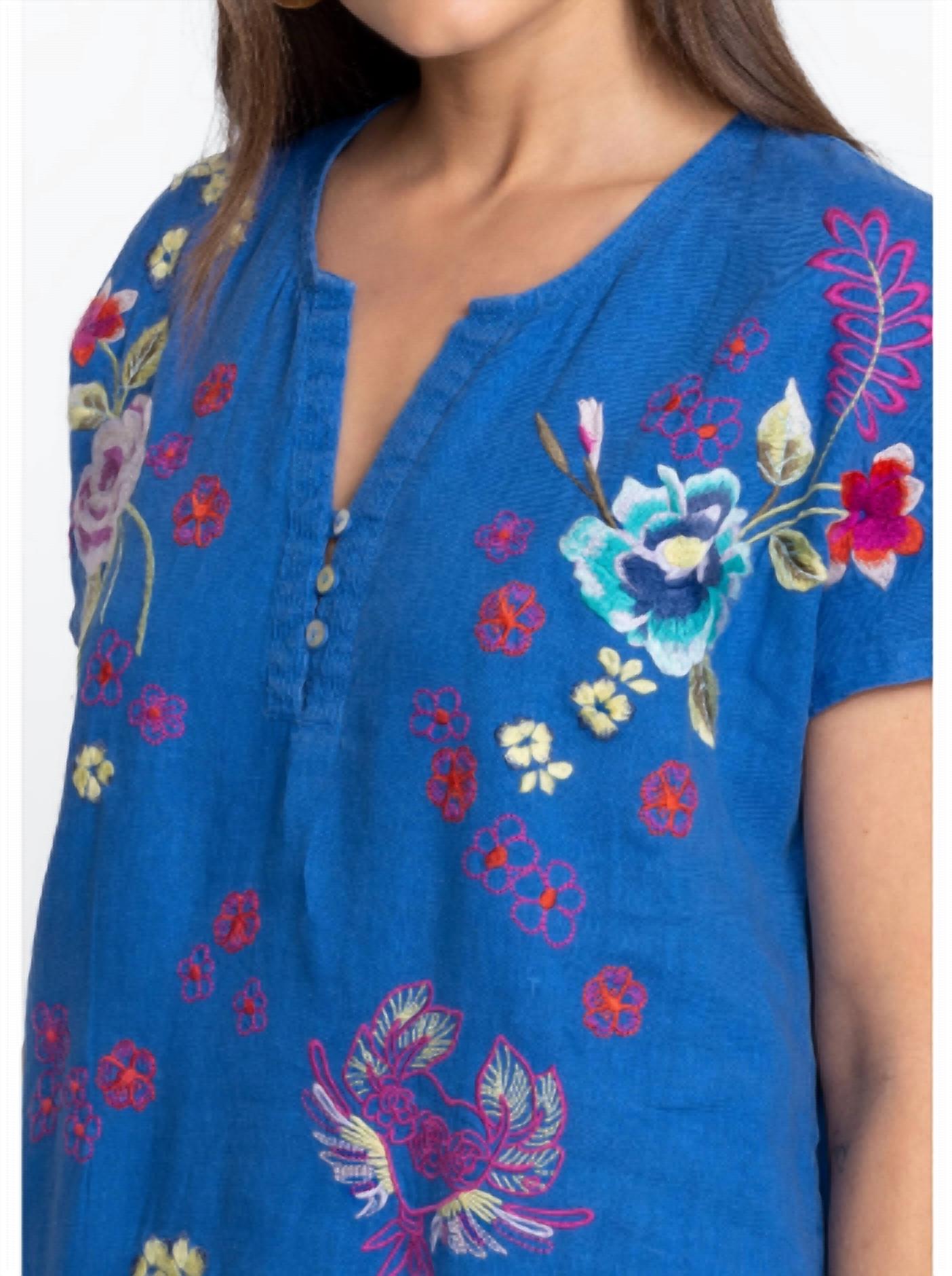 A short and breezy dress for those warmer days. Elevate your summer wardrobe with the Jessi Button Front Linen Dress from Johnny Was in a vibrant Nautical Blue. Perfect for a beach day or Thanksgiving gathering, this boho chic dress features a floral pattern and a flattering mini shift silhouette. It boasts short sleeves and a v-neckline, offering style and comfort. Made from breathable linen, it is designed with a button closure for easy wear and is machine washable with the convenience of tumble drying.