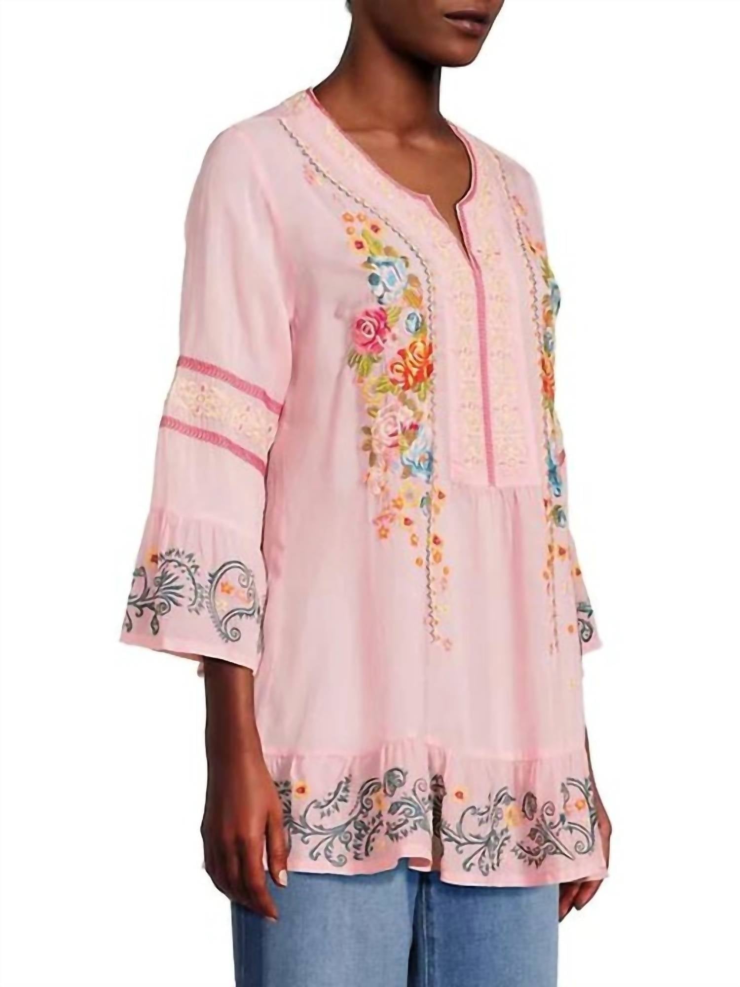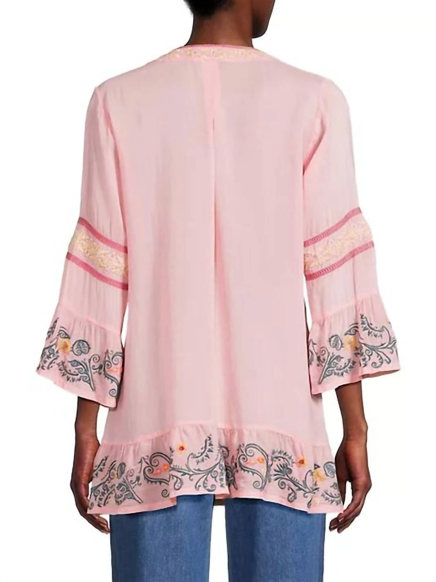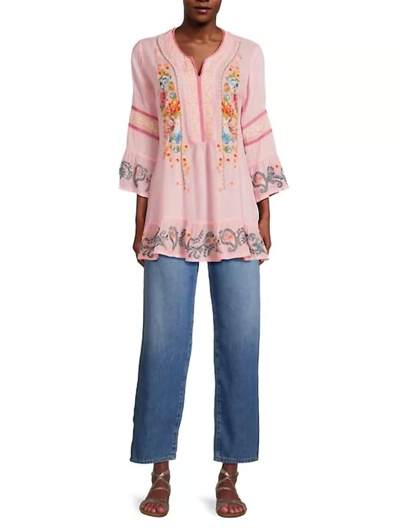 Discover the versatile charm of this tunic blouse, designed with both layering and standalone wear in mind. Its flattering silhouette and stylish details make it a closet essential. The Jojo tunic features intricate floral embroidery on the bodice and paisley-inspired motifs at the flounce cuffs and hem. It also has 3/4-length sleeves, flounce cuffs, and a flounce hem. Hand Wash