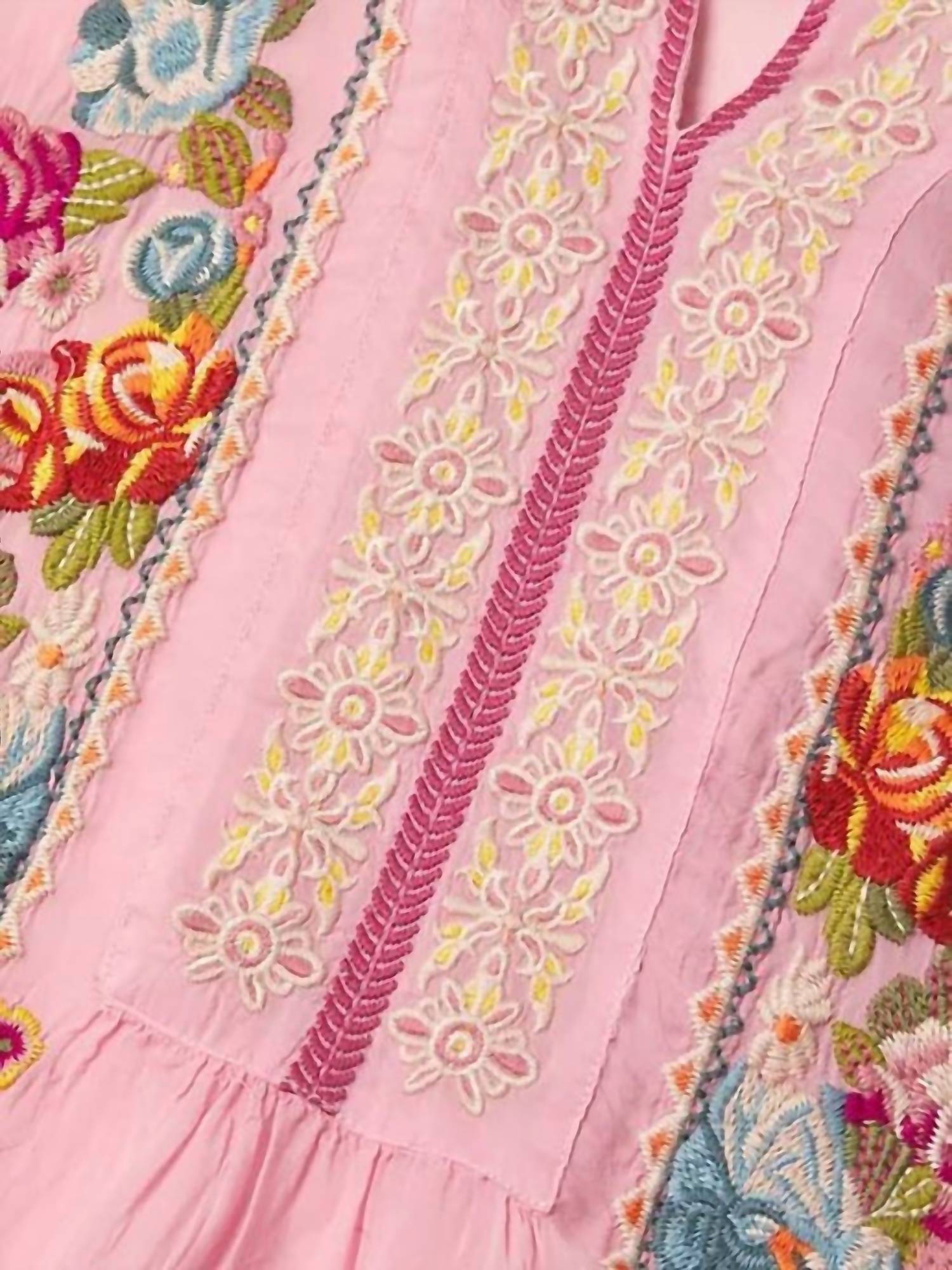 The Jojo tunic features intricate floral embroidery on the bodice and paisley-inspired motifs at the flounce cuffs and hem. It also has 3/4-length sleeves, flounce cuffs, and a flounce hem. Hand Wash