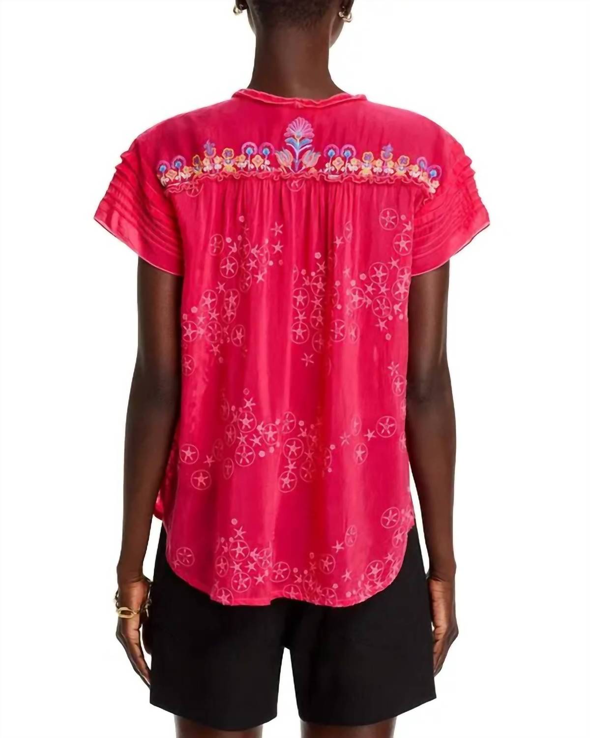 A versatile blouse that works from desk to dinner! Embrace boho-inspired style with this short-sleeve blouse, crafted from soft rayon for a light, breathable feel. Featuring intricate floral embroidery and a relaxed fit, it’s perfect for both casual outings and festive gatherings. Designed with a classic crewneck and button closure, it effortlessly combines comfort and charm. To preserve its detailed embroidery and vibrant look, hand wash with care.