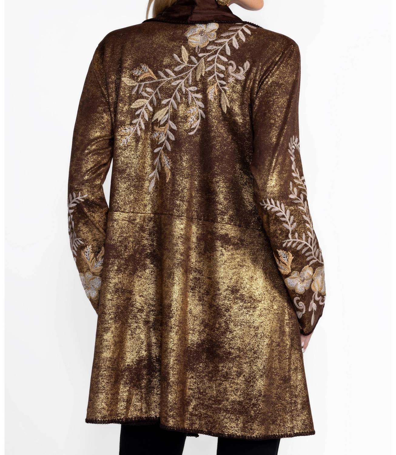 This cardigan will be a sweater-rotation favorite. Elevate your wardrobe with the Johnny Was Rilian Biya A-line Metallic Sweater, meticulously crafted with floral accents for a sophisticated flair. This long-sleeve cardigan features a V-neck lapel collar and an open front design that is beautifully finished with intricate embroidery and practical pockets. Made from 94% Polyethylene and 6% Spandex, this piece offers both comfort and style in a stunning Chocolate Gold Foil hue. Care: Dry clean only. Model is wearing a size small (5'9" height) with size medium measuring a bust of 41" and front length of 33 1/2".