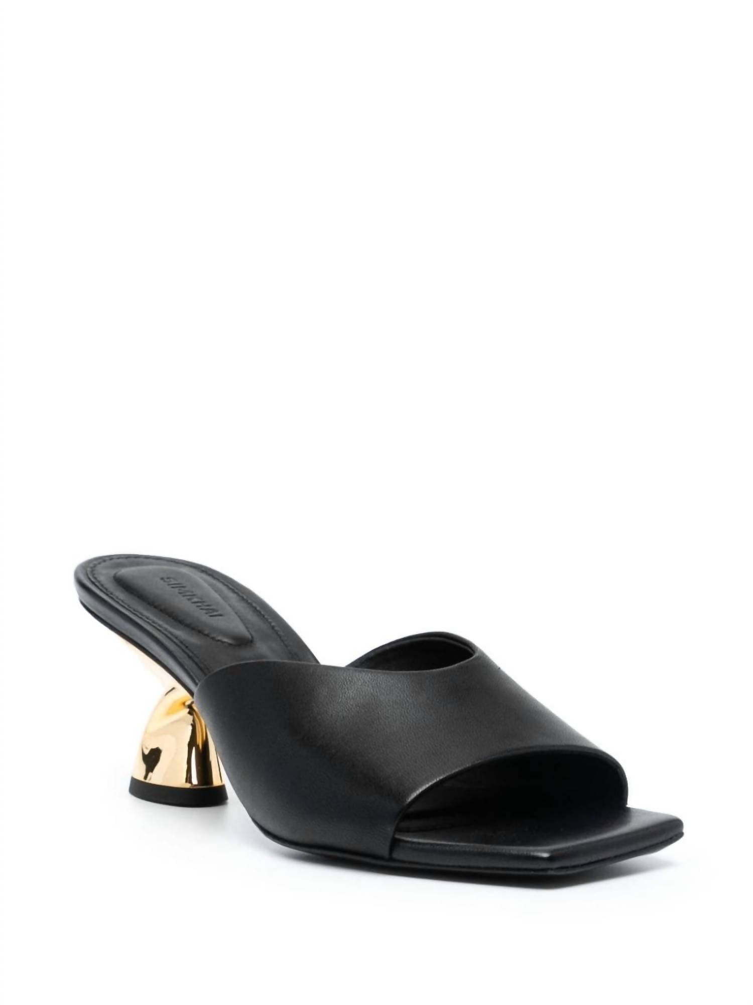 This sandal will take you from brunch to dinner and everything in between.Gold twisted heel. Open toe. 3.14" heel. Rubber sole. Slip On. Branded leather insole. 100% Leather.