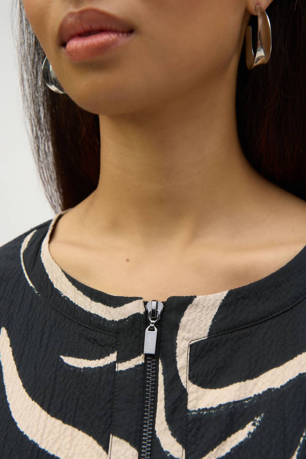 Embrace the perfect blend of comfort and style with the Abstract Print A-Line Dress by Joseph Ribkoff in Black/Parchment. Featuring short dolman sleeves, this dress is crafted from knit seersucker fabric, composed of 97% Polyester and 3% Spandex, offering a lightweight feel that's perfect for chic occasions. At a garment length of 38 inches, it boasts a crew neck with a convenient zip closure, patch pockets, and a striking abstract print. Care is simple: hand wash and lay flat to dry, keeping your dress in impeccable condition.