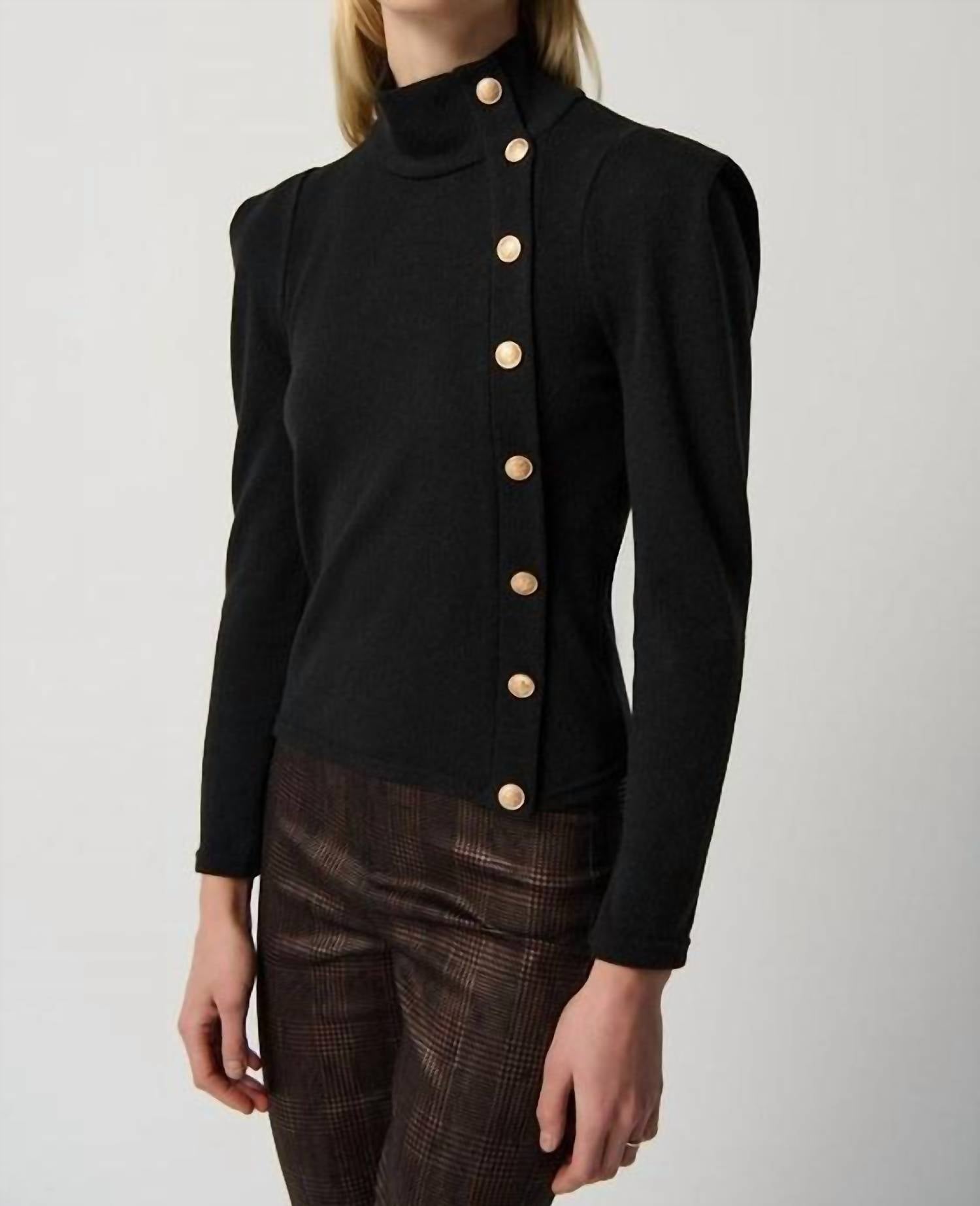 Fit to perfection and effortlessly chic. Elevate your office and casual wardrobe with the Joseph Ribkoff All Buttoned Up Sweater, designed in a versatile black hue. This top features long sleeves and is crafted from a cozy viscose blend, ensuring both texture and warmth. Graced with button details and pleats, it offers a classic yet timeless look, highlighted by a French-inspired mock neck. Closure is a button type, and care is simple with hand washing and line drying recommended.