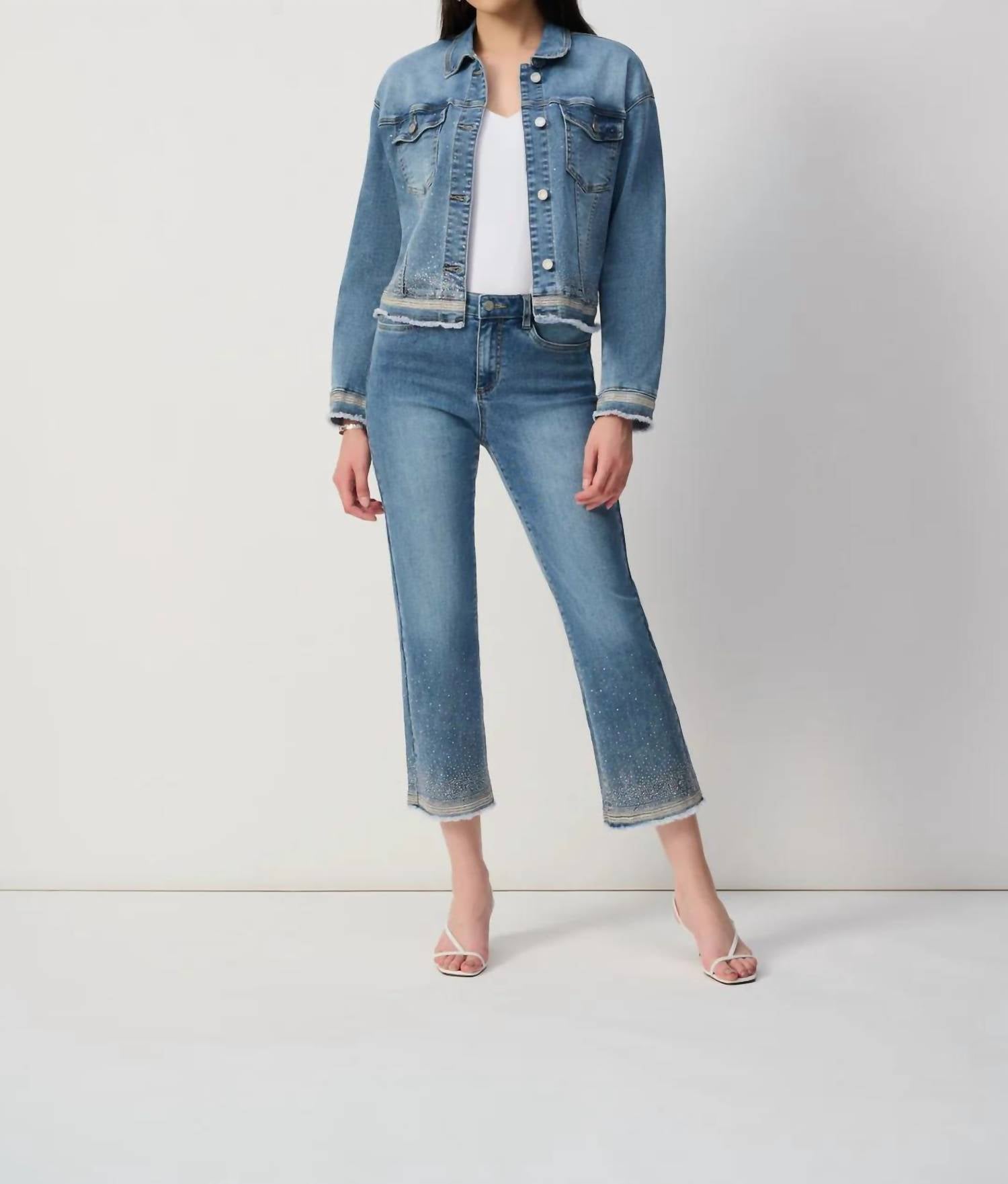 Effortlessly stylish and versatile, the Joseph Ribkoff Vintage Blue Denim Cropped Frayed Hem Jeans are a must-have for any fashion-forward wardrobe. Featuring a 5-pocket style, deconstructed cuffs, and frayed hems, these crop flared jeans add a touch of edge to any outfit. Pair them with your favorite top for a chic and trendy look. Best paired with the Jospeh Ribkoff 251953 jacket.