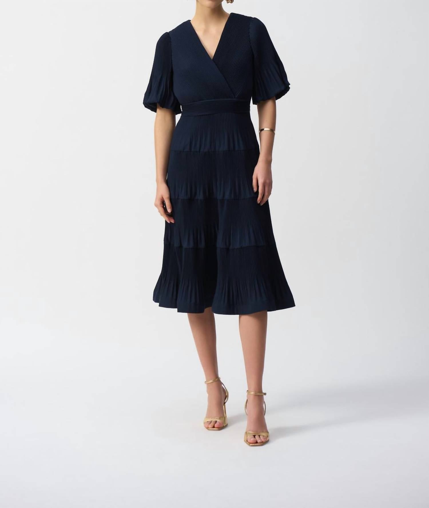 Just add slides or mules and you are good to go. This V-neck midi dress features a flowing trapeze silhouette and puffed elbow-length sleeves, offering both elegance and ease of movement. The wrap-style bodice accentuates the waist, while pleating in the skirt adds depth and graceful motion, making it a refined choice for any occasion.