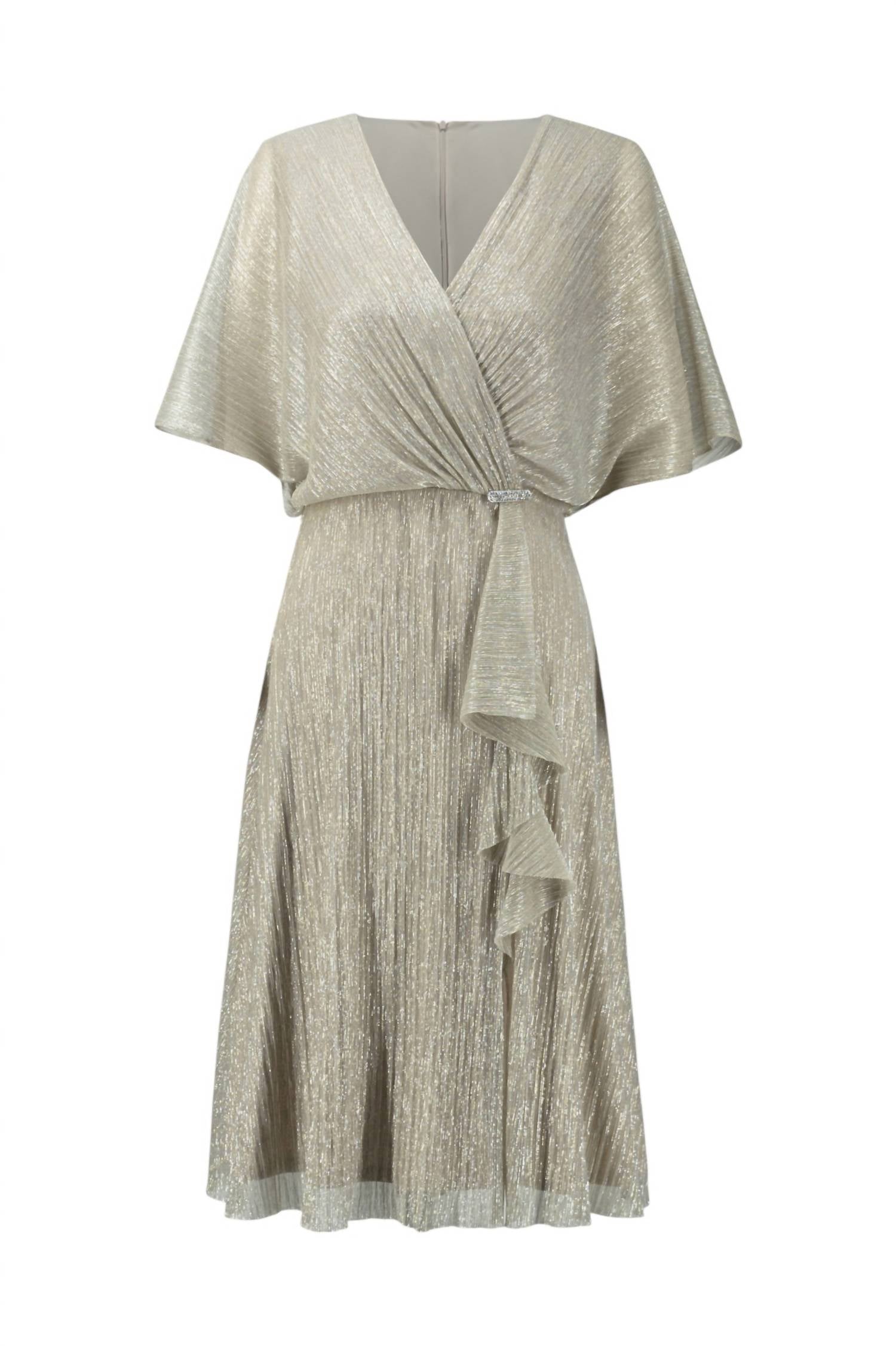 Introducing the V-neck Wrap Dress by Joseph Ribkoff, a perfect blend of elegance and sophistication with its short sleeves and feminine wrap style. Crafted from 55% Polyester and 45% Metal, this textured midi dress showcases a champagne/gold sheen, ideal for formal occasions. Made in Canada, it features a back zip closure and is approximately 38" or 97 cm in length for size 12, ensuring a flattering fit. Care for this stylish piece with a cold hand wash to maintain its luxurious feel.