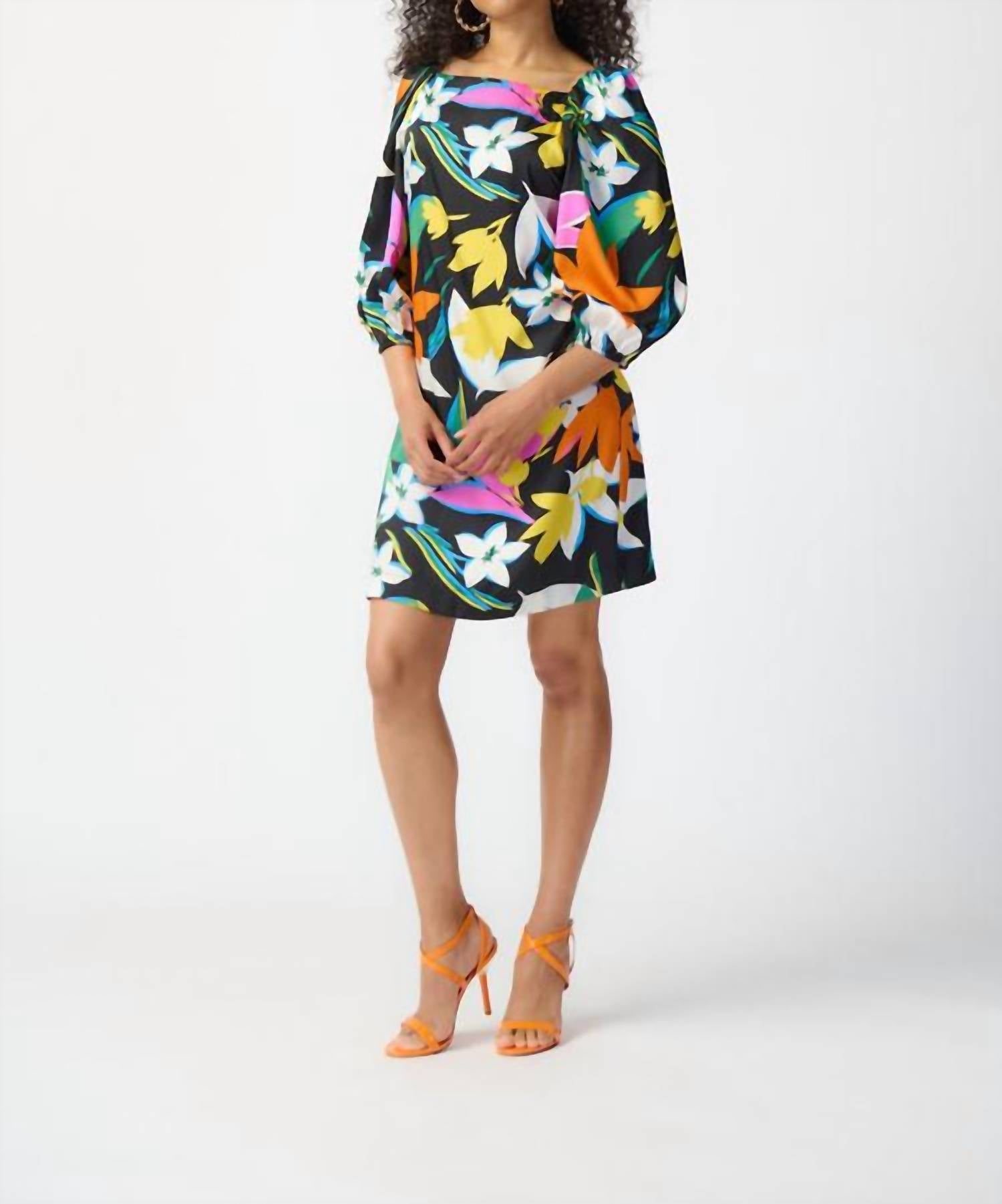 Comfortable and cute, this casual day dress has it all. Introducing the Women's Large Flower Dress by Joseph Ribkoff, a vibrant piece perfect for any summer occasion. This dress features long sleeves with a square neckline that beautifully complements the boho chic floral pattern. Its shift silhouette offers a loose, comfortable fit while being stylishly adorned with bright, majestic flowers on a solid background. Closure: Pull on. Care: Machine wash. Ideal for vacation wear.