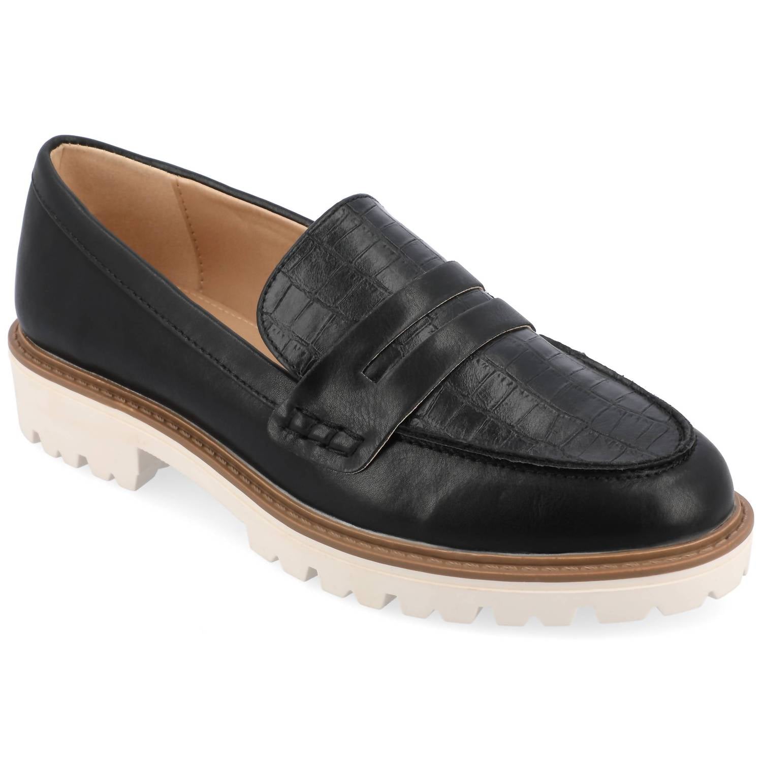 A classic loafer that is both comfortable and polished. Step into timeless elegance with the Women's Tru Comfort Foam™ Kenly Flat by Journee Collection, a black loafer merging traditional style with modern comfort. This sleek design features a chic croc-textured accent at the vamp and a contemporary white 1.5-inch chunky block heel. Crafted from soft vegan leather with a slip-on closure, it ensures each step feels effortless with a 4 mm Tru Comfort Foam™ footbed. This loafer offers medium width and a round toe, combining classic and contemporary elements seamlessly.