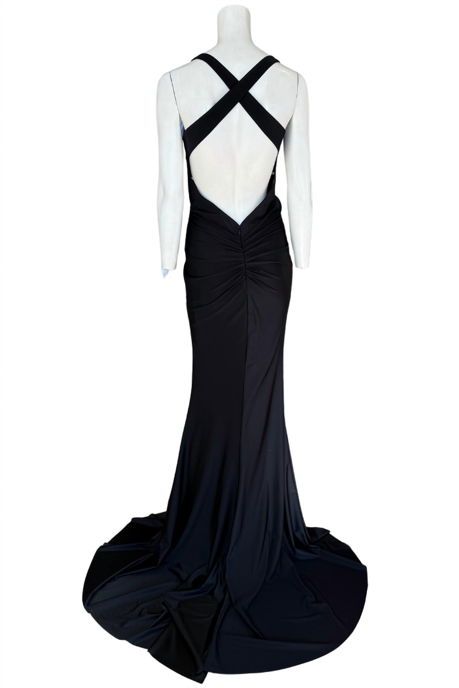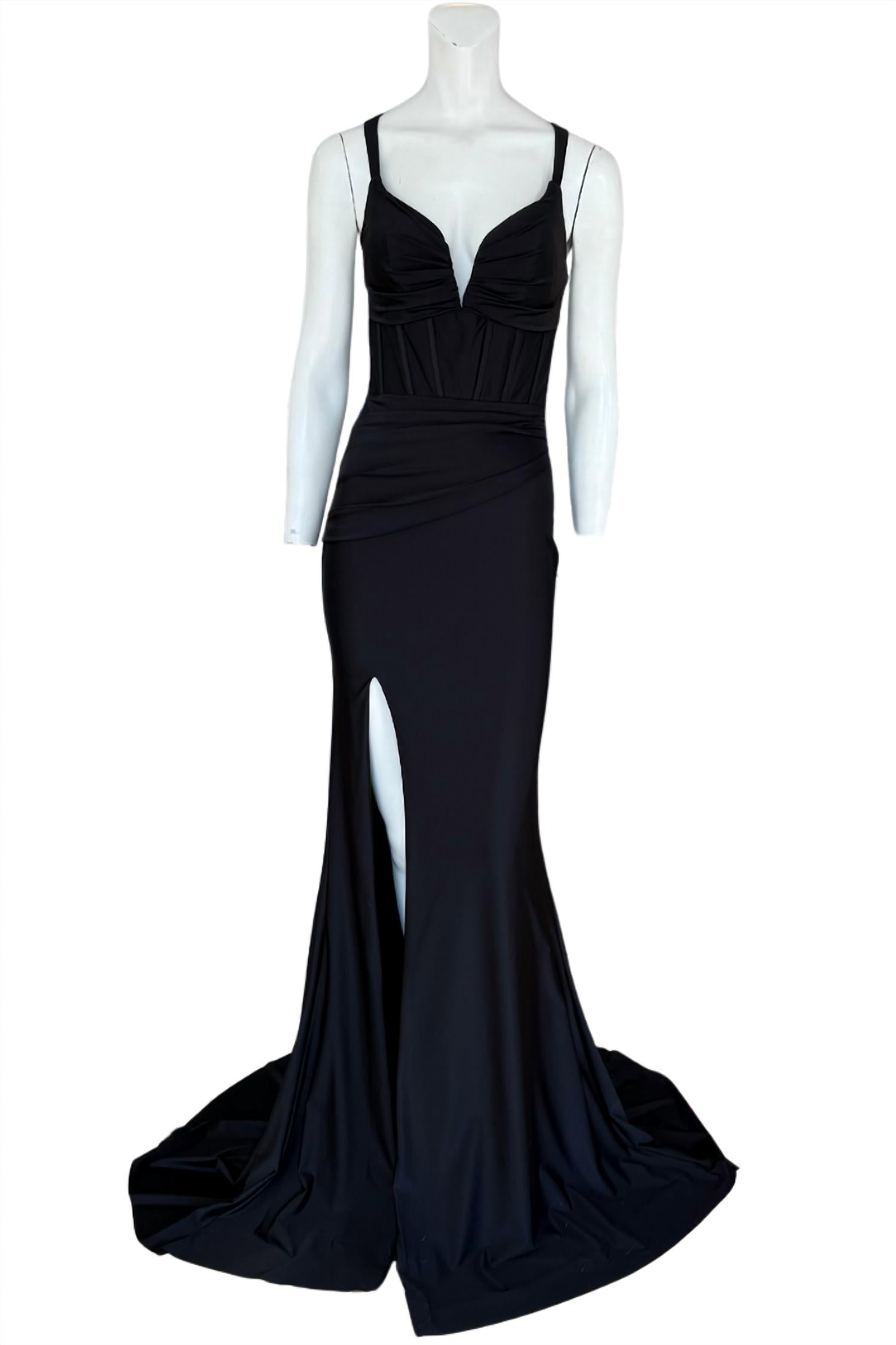 Style this maxi with your favorite statement necklace and sandals for the perfect look. This stunning Jovani halter gown style 5027 embodies elegance with its floor-length silhouette and exquisite ruched bodice that enhances the figure. The gown features a daring high slit, adding a touch of allure and sophistication. The open back design is accentuated by a single strap, creating a captivating and sultry look perfect for any formal occasion.
