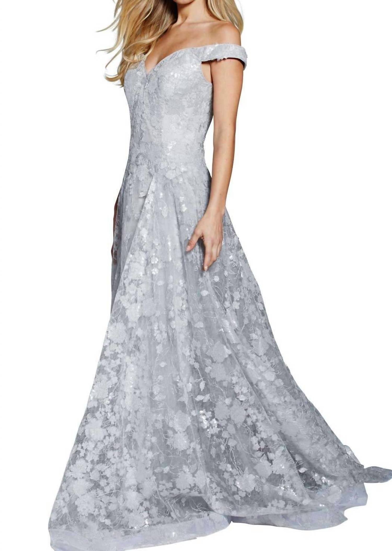 Just add a cute little clutch and a matching heel for the perfect event look. Introducing the JOVANI Diaphanous Off-the-Shoulder Gown, an elegant choice for any formal event. With its cap sleeves and off-the-shoulder neckline, this gown exudes sophistication. In a solid silver hue, it features a fit and flare silhouette enhanced by sculpting seams and softly layered pleats. Zip closure.