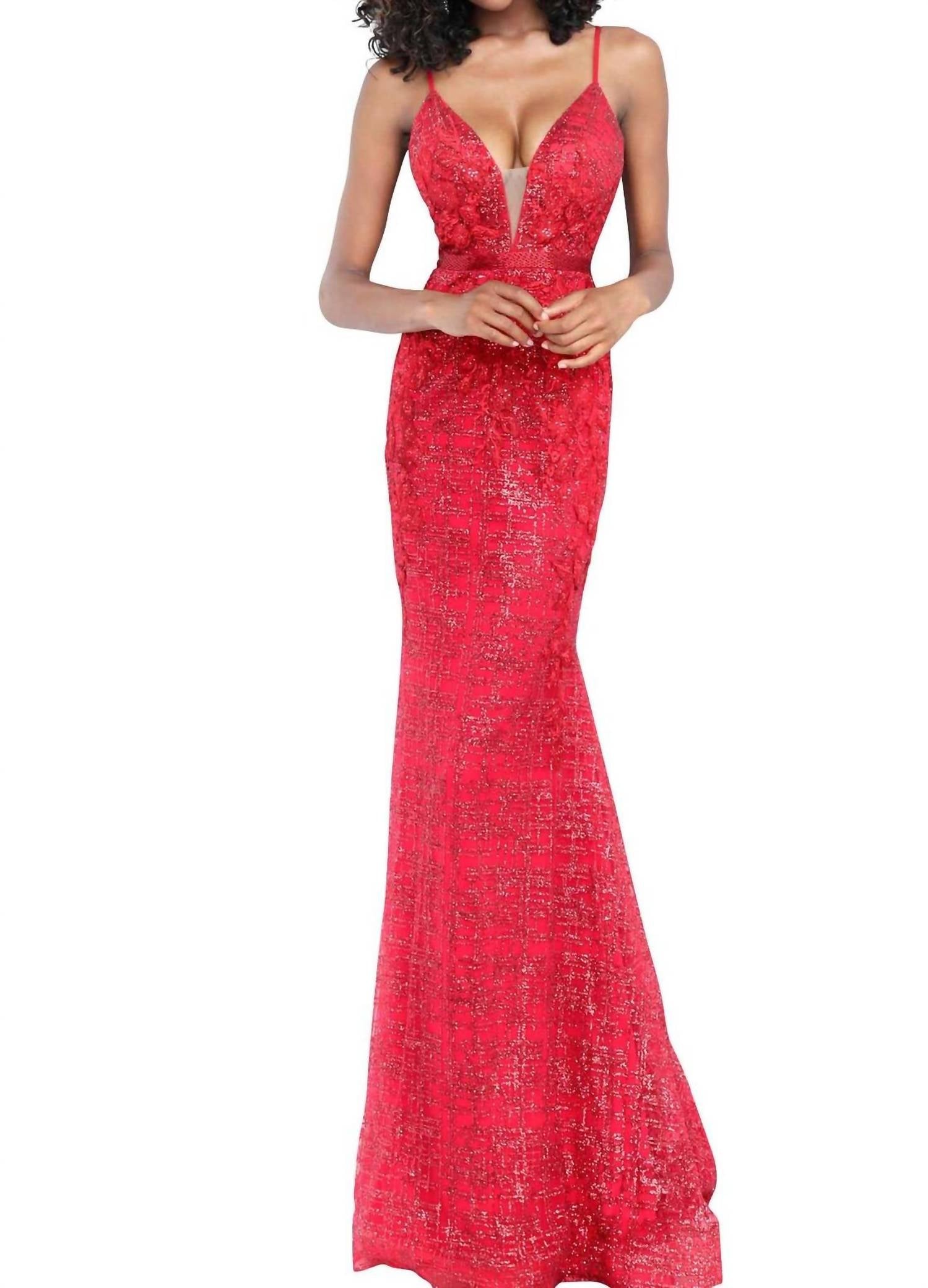 Looking for that perfect event dress? Look no further... Introducing the Embroidered Floral Appliqued Gown by JOVANI, an exquisite red dress perfect for prom or Christmas celebrations. This full-length gown features delicate spaghetti straps and a romantic V-neckline, accentuated by an intricately embroidered lace bodice with floral patches. The textured pattern and trumpet silhouette gracefully flatter your figure. Zip closure. Dry clean only.