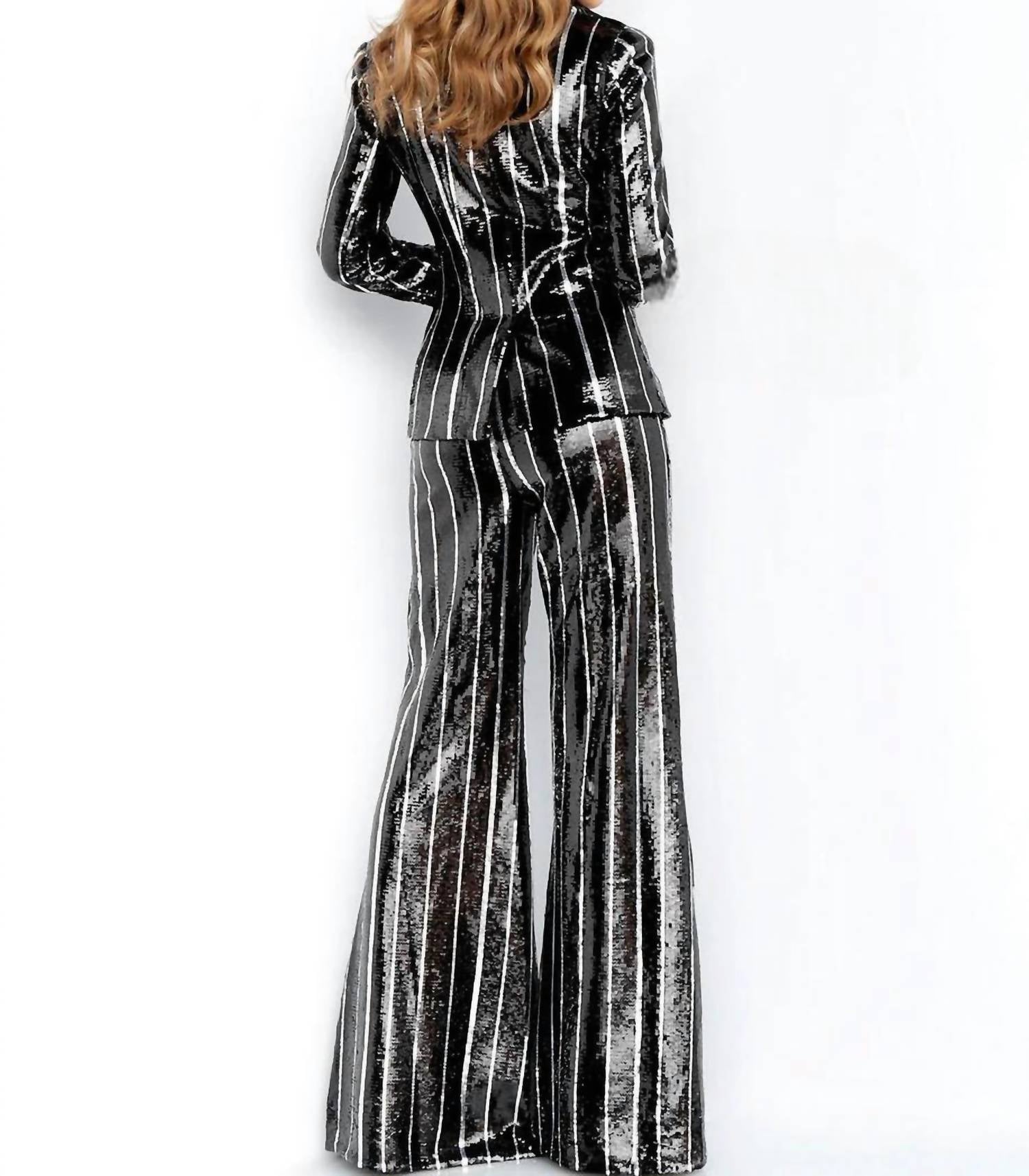 An elevated version of your favorite classic blazer. Step into elegance with the Flare Leg Sequin Evening Pant and Blazer Suit by JOVANI, crafted for sophisticated occasions. This striking suit features a fitted blazer with a plunging V-neckline and slender long sleeves, while the full-length pants flare beautifully. Designed in vibrant black and silver striped sequins, it boasts a chic button closure. For the best care, please dry clean this ensemble.