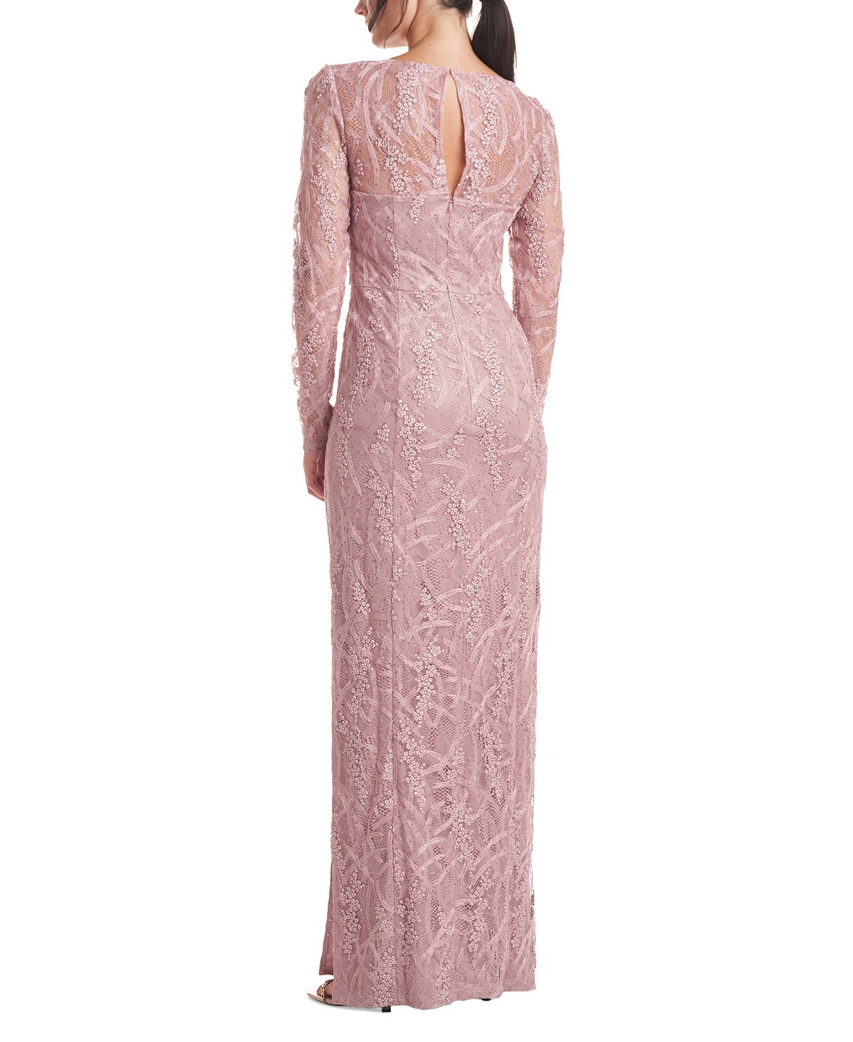 Intricate embroidery is sprinkled with sequins and slit at the side of this square-neck column gown from JS Collections. Fine lines for formal times| the gown is ideal for a mother of the bride or groom.| Runs true to size; order your normal size| Allover embroidered sequin lace| Square neckline| Hidden zipper at center back