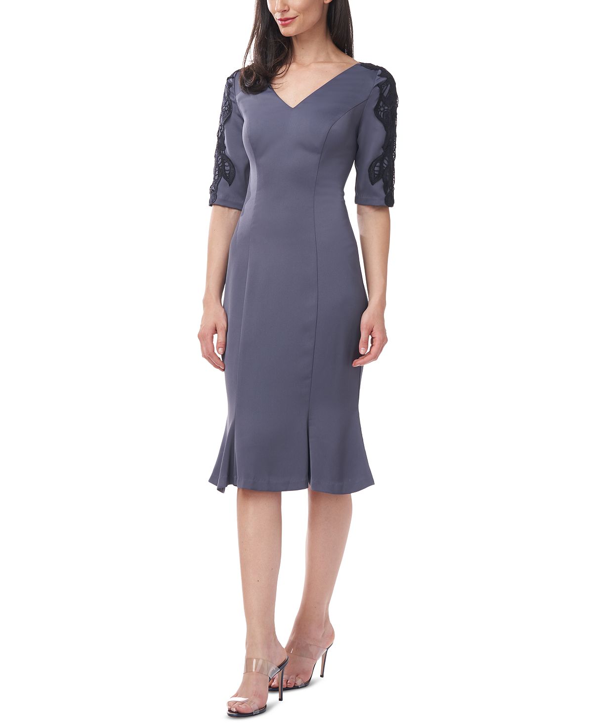 Styled to fit & flare exactly where it should| this knee-length dress by JS Collections features elbow sleeves with a little extra detail.| Approx. 41-1/2 long from center back neck to hem. Length is based on size 4 and varies 1/4 between sizes| Fitted through the chest and waist; flared and flowing skirt| V-neck; Fit & flare silhouette| Back zipper closure
