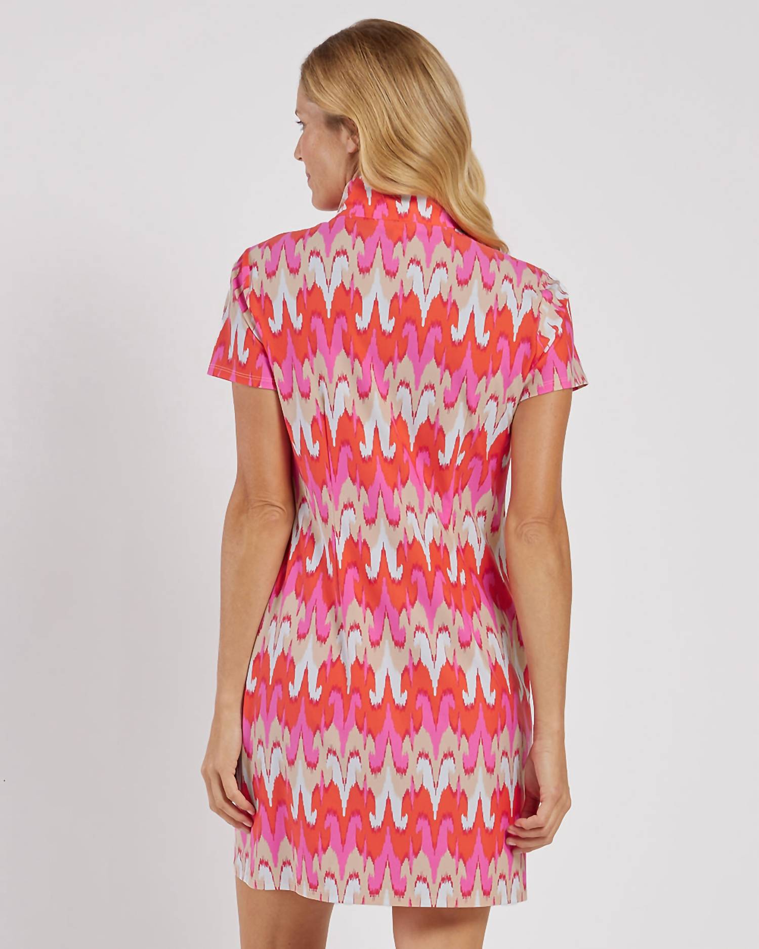The perfect mini dress for those warmer months. Introducing the Alexia Short Sleeve Mini Dress by Jude Connally, a colorful piece in Paradise Ikat Peony perfect for adding a vibrant touch to any occasion. Designed with a flattering short sleeve, shift silhouette, and a chic quarter zip collar neckline, this dress combines comfort and sporty sophistication in the brand's signature Jude Cloth. Crafted from nylon and spandex, it measures 35.5 inches from the center back, making it a fashionable summer essential made right here in the U.S.A. Care for this patterned garment with ease by machine washing and line drying, ensuring it remains a staple in your wardrobe.