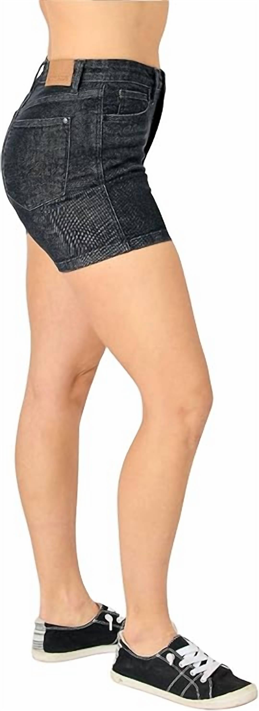 Introducing the Judy Blue Women's High-Rise Tummy Control Washed Black Denim Shorts, a perfect blend of fashion and function. These shorts feature a high-rise waist with built-in tummy control for a flattering silhouette and a washed black finish for versatility. With a structured design and classic five-pocket style, they boast a rise of 11" and an inseam of 4". 92% Cotton, 7% Polyester, 1% Spandex. Button closure. Machine wash and tumble dry.